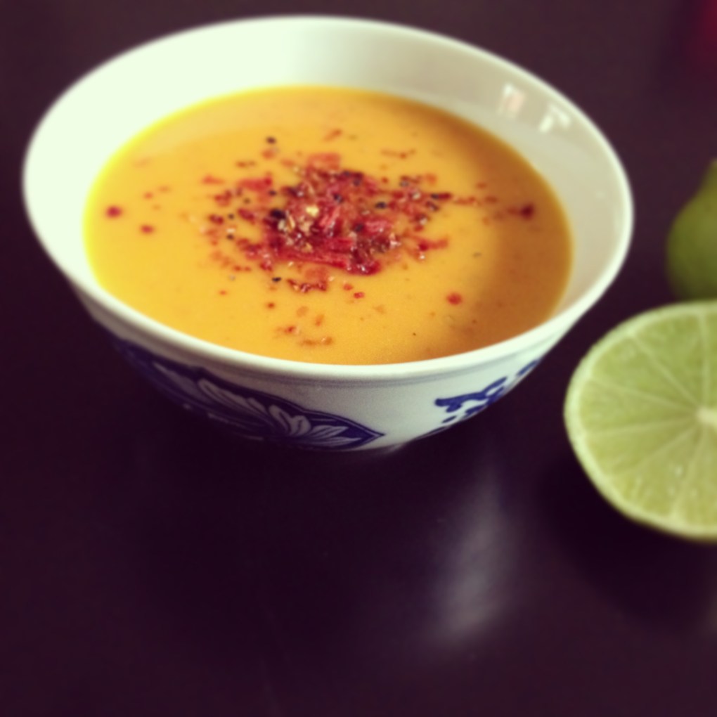Deze gezonde knol bevat onder andere veel beta caroteen, vitamine C, vitamine B6 en kalium. Het smaak licht zoet, zacht en romig en kan in zowel hartige, als zoete gerechten verwerkt worden. In dit soepje combineert het heerlijk met het romige van de kokosmelk en de pit van het rode pepertje. Voor een herfstig tintje kun je de zoete aardappel ook door pompoen vervangen.