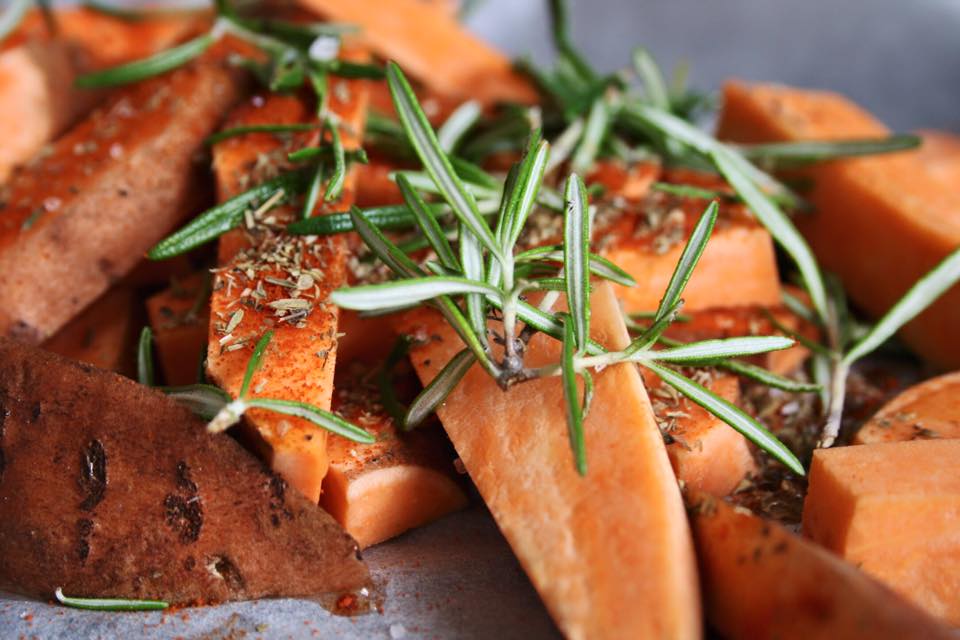 Deze zoete aardappelfrietjes uit de oven heb ik gecombineerd met knoflook & verse rozemarijn en/of tijm. Dit gerecht smaakt heerlijk met een gegrilde zalmfilet en een grote groene salade of gestoomde broccoli. Wil je meer weten over de vele gezondheidsbevorderende eigenschappen van de zoete aardappel? Kijk dan even bij het recept van de Aziatische zoete aardappelsoep.