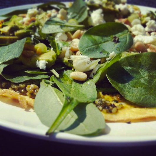 - besmeer het met de groene pesto en verdeel vervolgens de andere ingrediënten erover