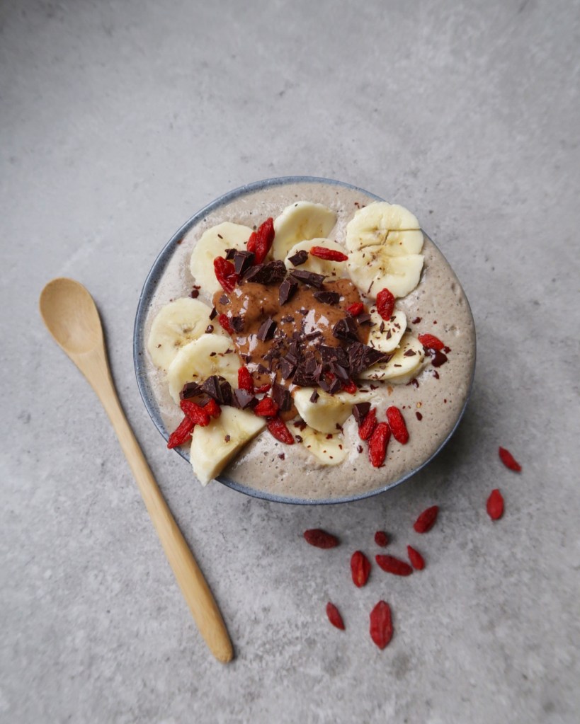 - toppings naar keuze, zoals: plakjes banaan, bessen, appel, kokosrasp, notenpasta, pure chocolade (minimaal 85% cacao), noten, zaden, gedroogd fruit etc.