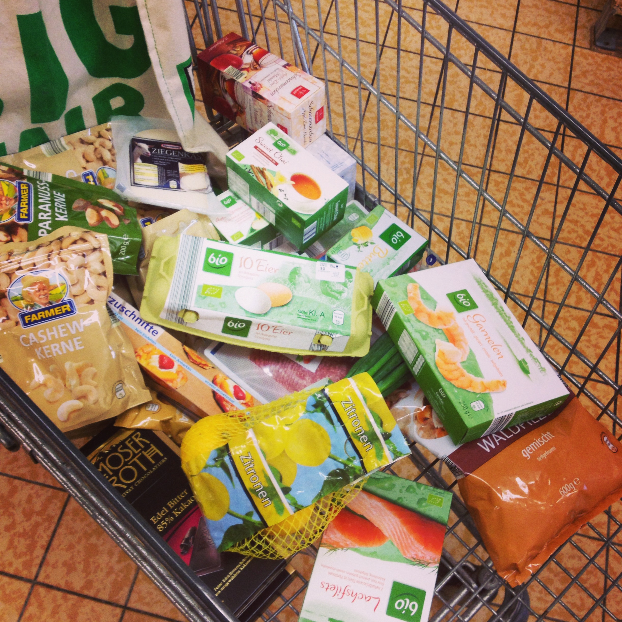 Afgelopen zaterdag was het weer zover; in alle vroegte vertrok ik samen met vriendlief richting Kranenburg. Mijn buit na een ochtendje shoppen is te bewonderen op de foto’s. Bij de Aldi haalde ik onder andere bio zalm (4,99), bio garnalen (4,99), bio gerookte zalm (2,79), 85% pure chocolade (0,99 per reep), een zakje bio citroenen (0,69), rauwe cashewnoten (1,99) en nog veel meer. Bij de DM kwam ik ook met een goedgevulde tas naar buiten: 4 pakjes gezichtsreinigingsdoekjes (a 1,95 per stuk), spelt-pretzels voor vriendlief (0,85 per stuk), kokoswater  (1,75 per pakje), tube biologische tomatenpuree (1,15), Alverde shampoo (1,75),  Lavera gezichtsmaskertje (1,95) en ga zo nog maar door ;). Met een volle auto en een iets lichtere portemonnee vertrokken we weer richting Nijmegen. Zo slecht is het nog niet om hier te wonen!