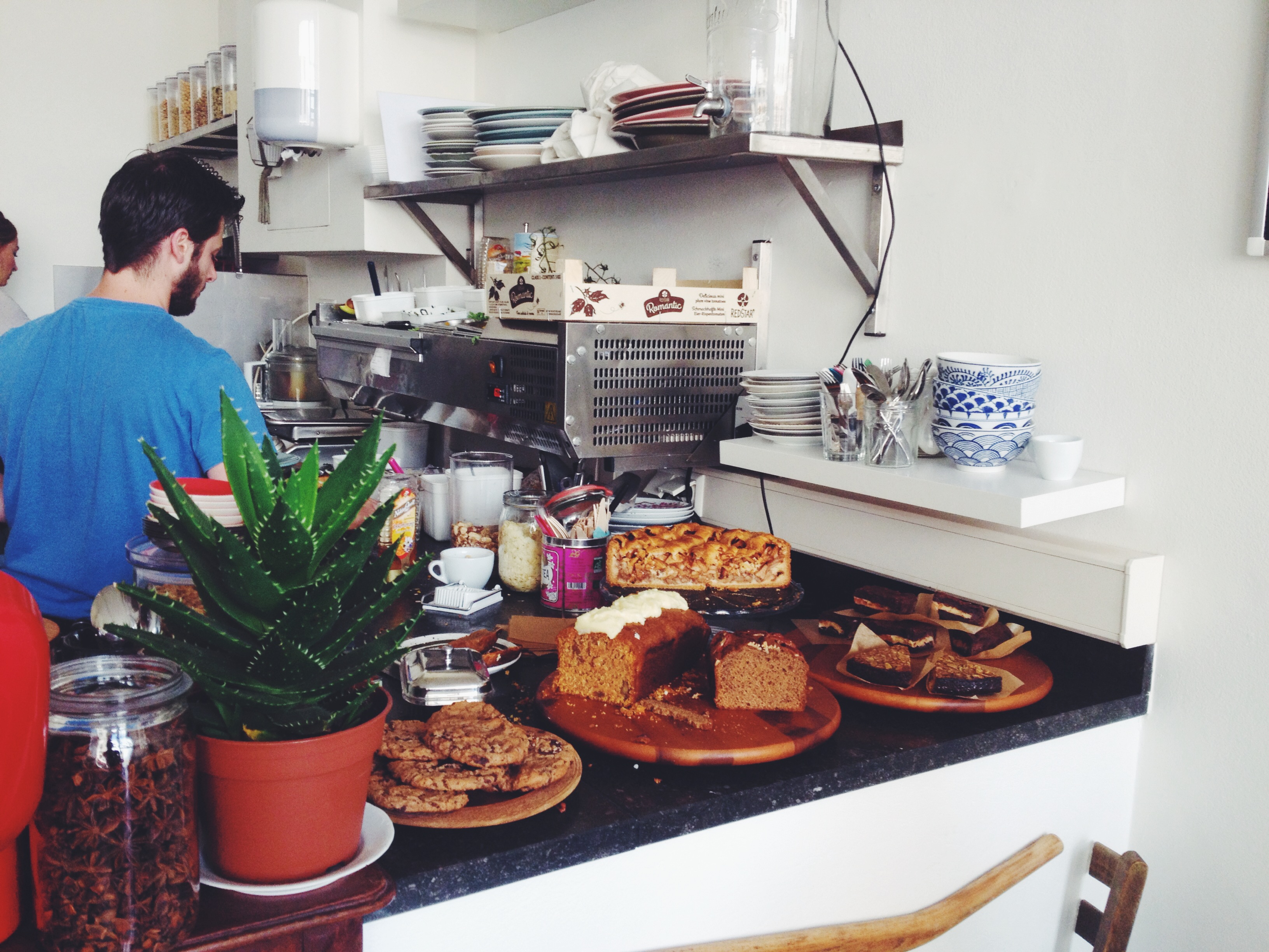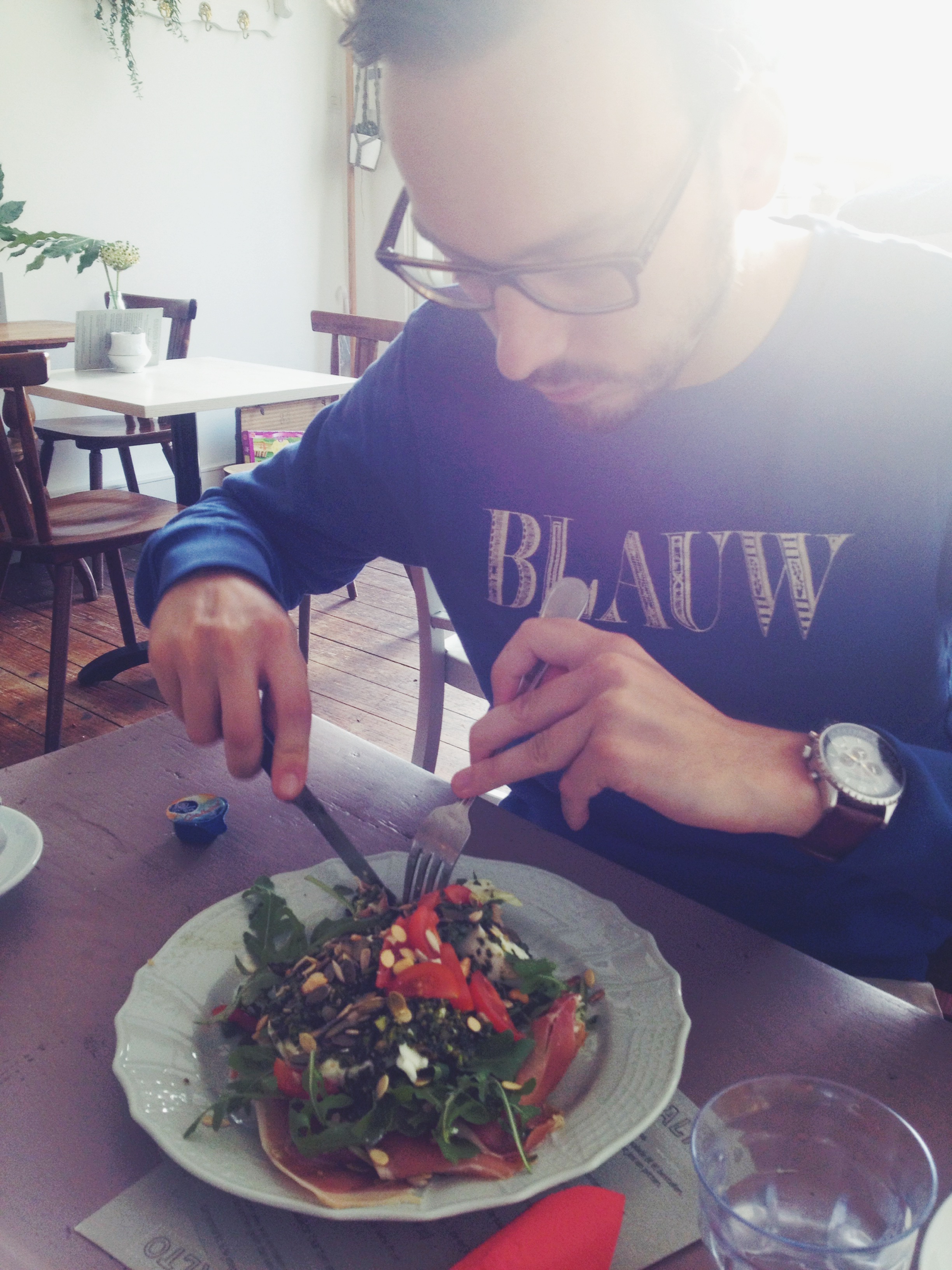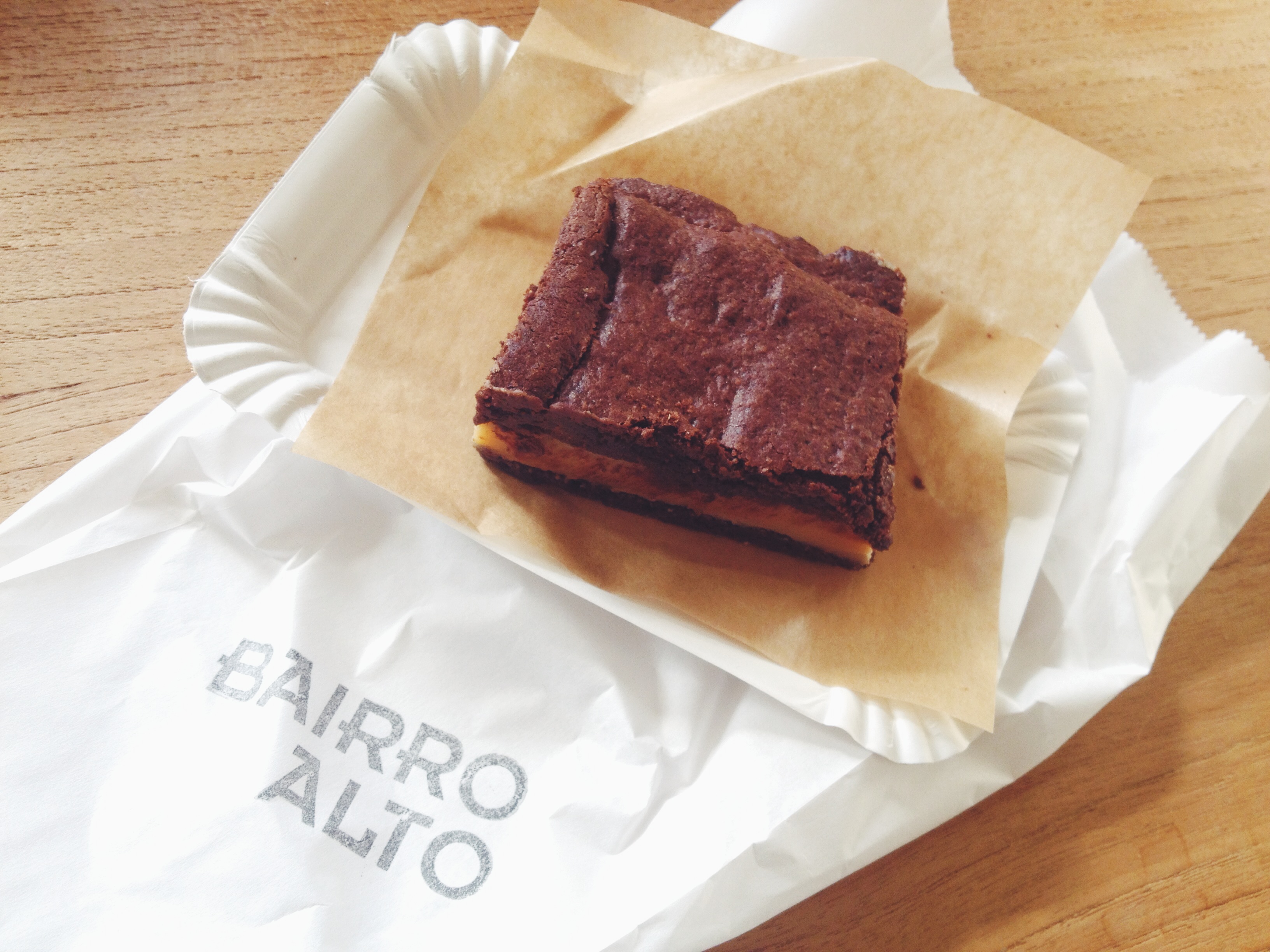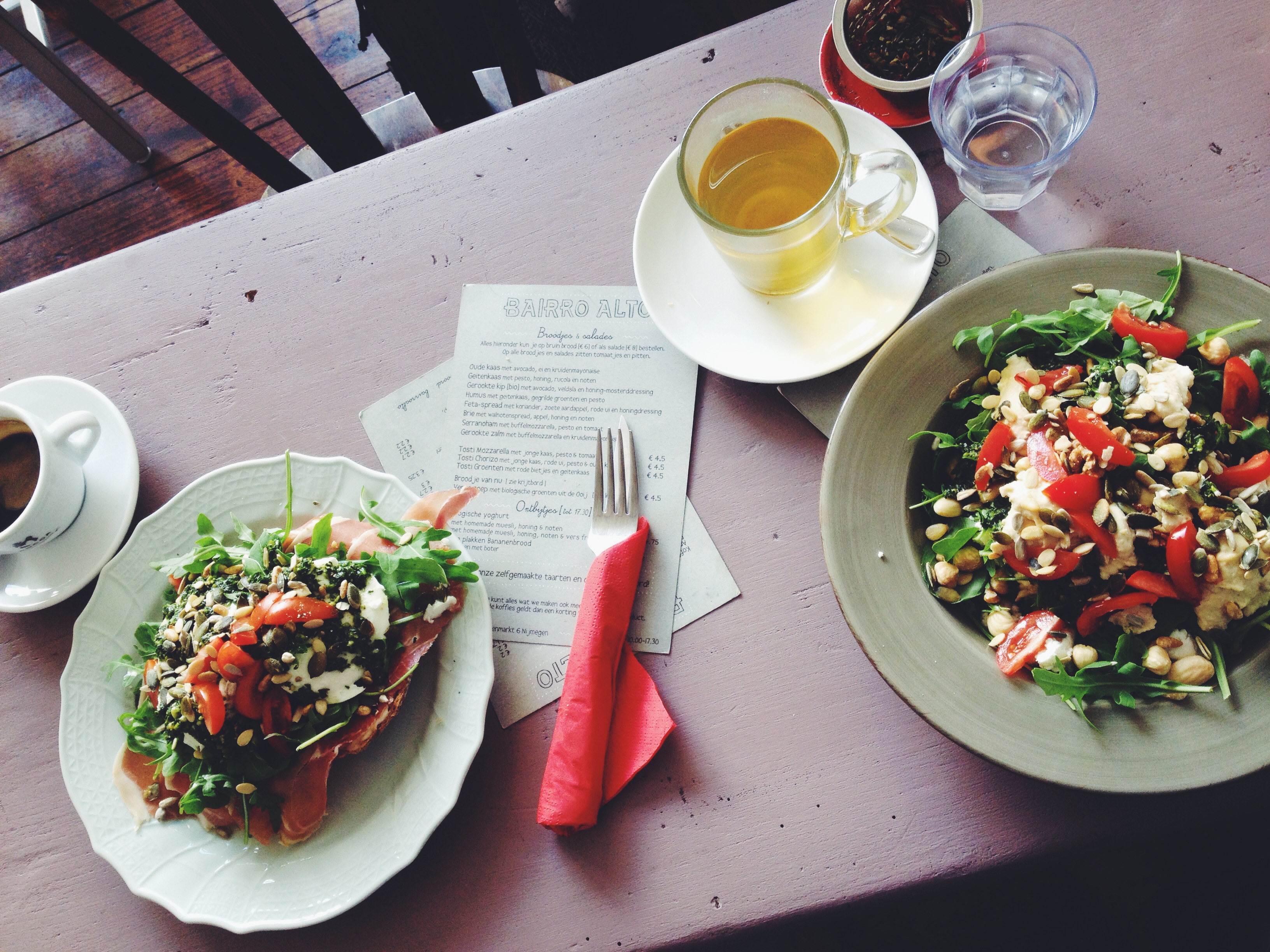 Op de kaart vind je gezonde salades, smoothies, soepen, yoghurt met muesli, rijkelijk belegde broodjes, taartjes, bananenbrood en andere lekkernijen (die vrolijk staan uitgestald op de toonbank). Alles is huisgemaakt en er wordt veel gewerkt met biologische producten. Bairro Alto staat vooral bekend om zijn lekkere koffie en de zelfgebakken taarten. Je kunt ook een kleedje lenen en in het parkje ertegenover gaan zitten om van je bestelling te genieten bij mooi weer. Ook heel fijn; je kunt bestellingen ook afhalen. Afgelopen woensdag vierde mijn vriend en ik dat we 5 jaar bij elkaar zijn; dat leek ons een goede gelegenheid om eens te gaan lunchen bij Bairro Alto. Daar hebben we geen moment spijt van gehad! Ik bestelde een salade met gegrilde groenten, geitenkaas, humus en noten; ik kan zeker zeggen dat ik waar voor mijn geld heb gekregen! De salade was overheerlijk en zeer rijk gevuld waardoor ik nog uren (prettig) vol zat. Mijn vriend ging voor een broodje met parmaham met pesto en mozzarella. Ook hij heeft genoten! Ondanks dat we behoorlijk vol zaten hebben we ons laten verleiden door de salted-sticky-caramel brownie die naar ons lag te lonken vanaf de toonbank… Dus hebben we er een mee naar huis genomen om te delen. Man man wat lekker; een heerlijk 80/20 momentje! Ga dus vooral eens langs bij Bairro Alto als je in de buurt bent; écht een aanrader!