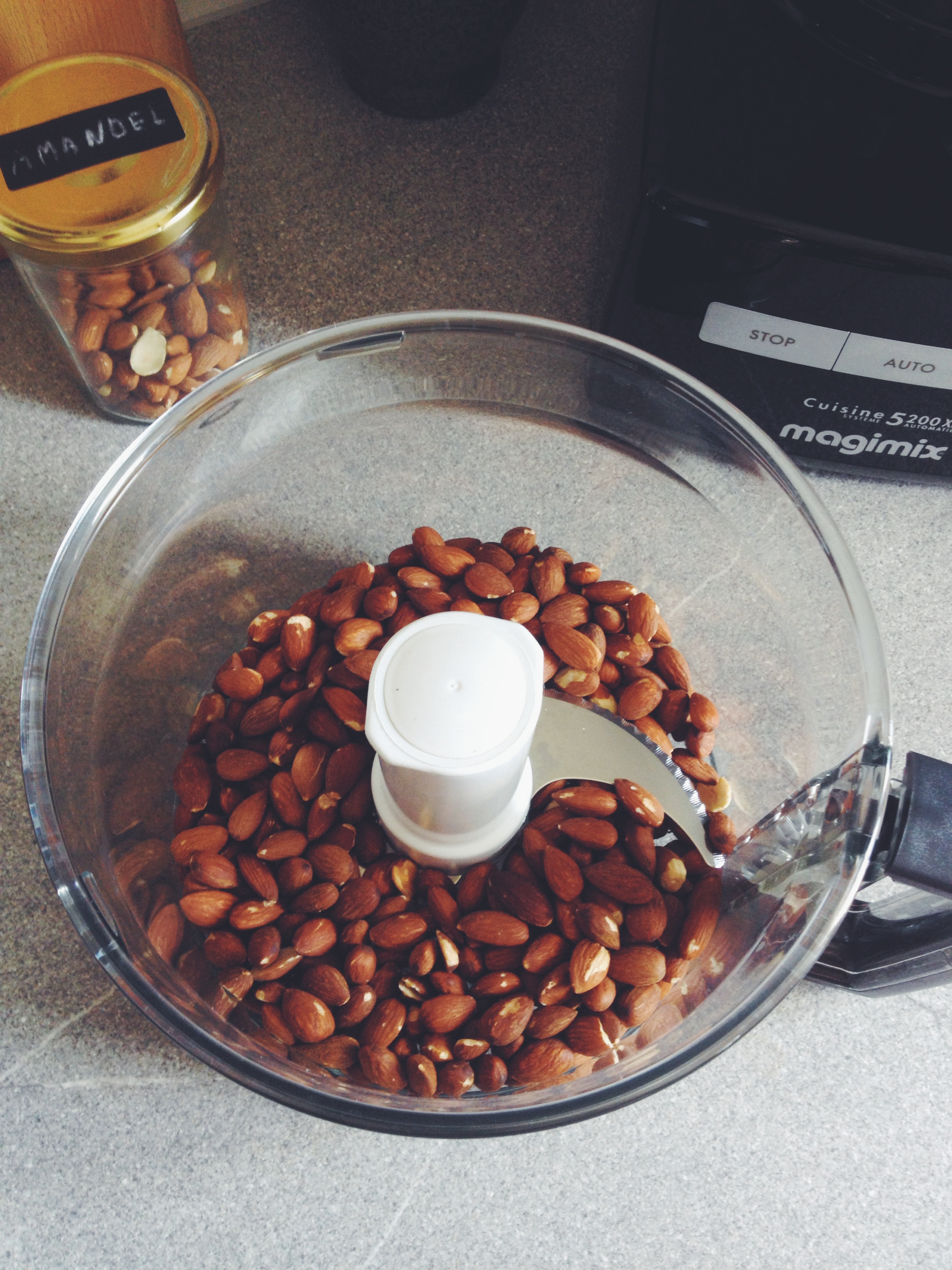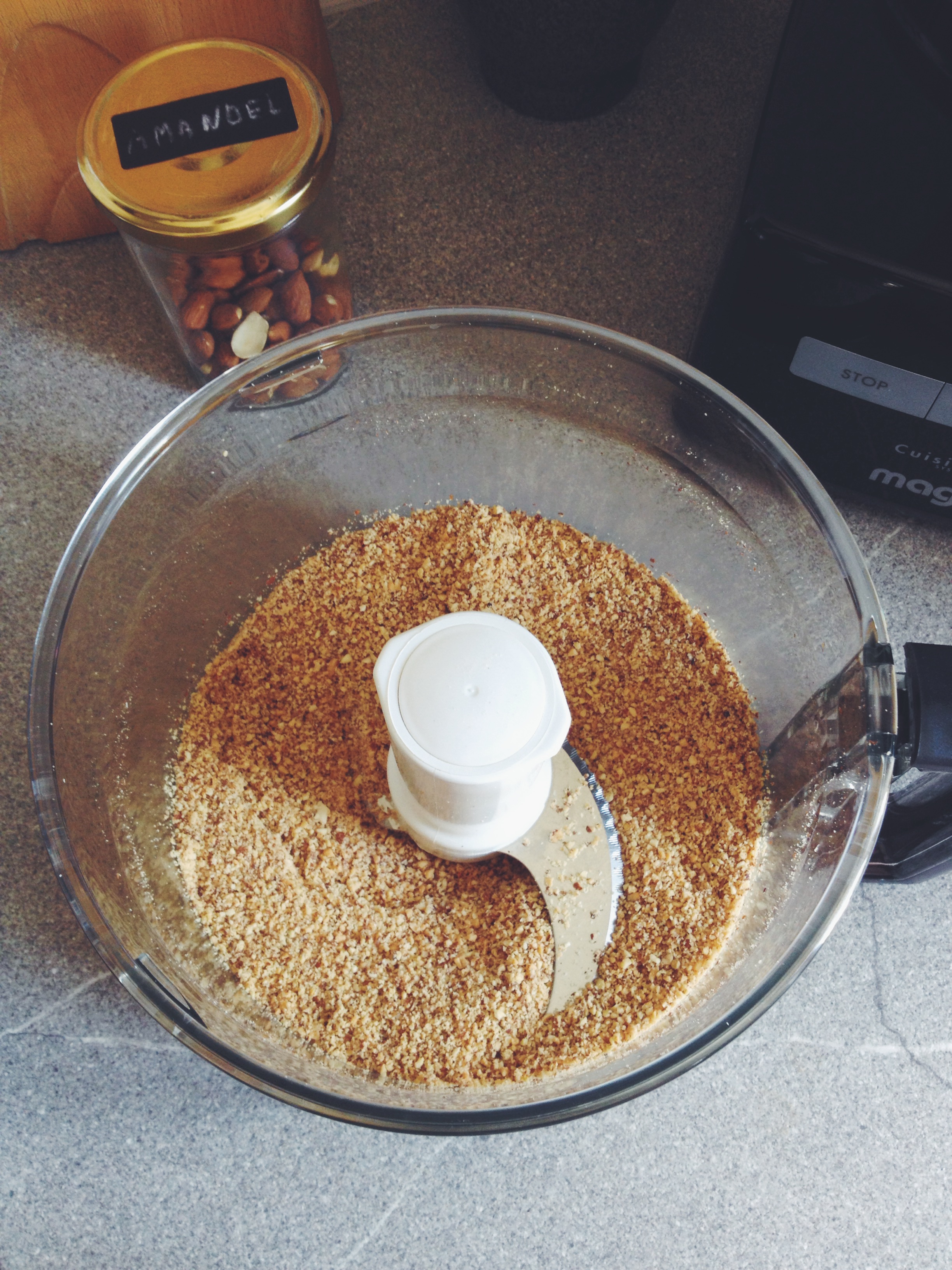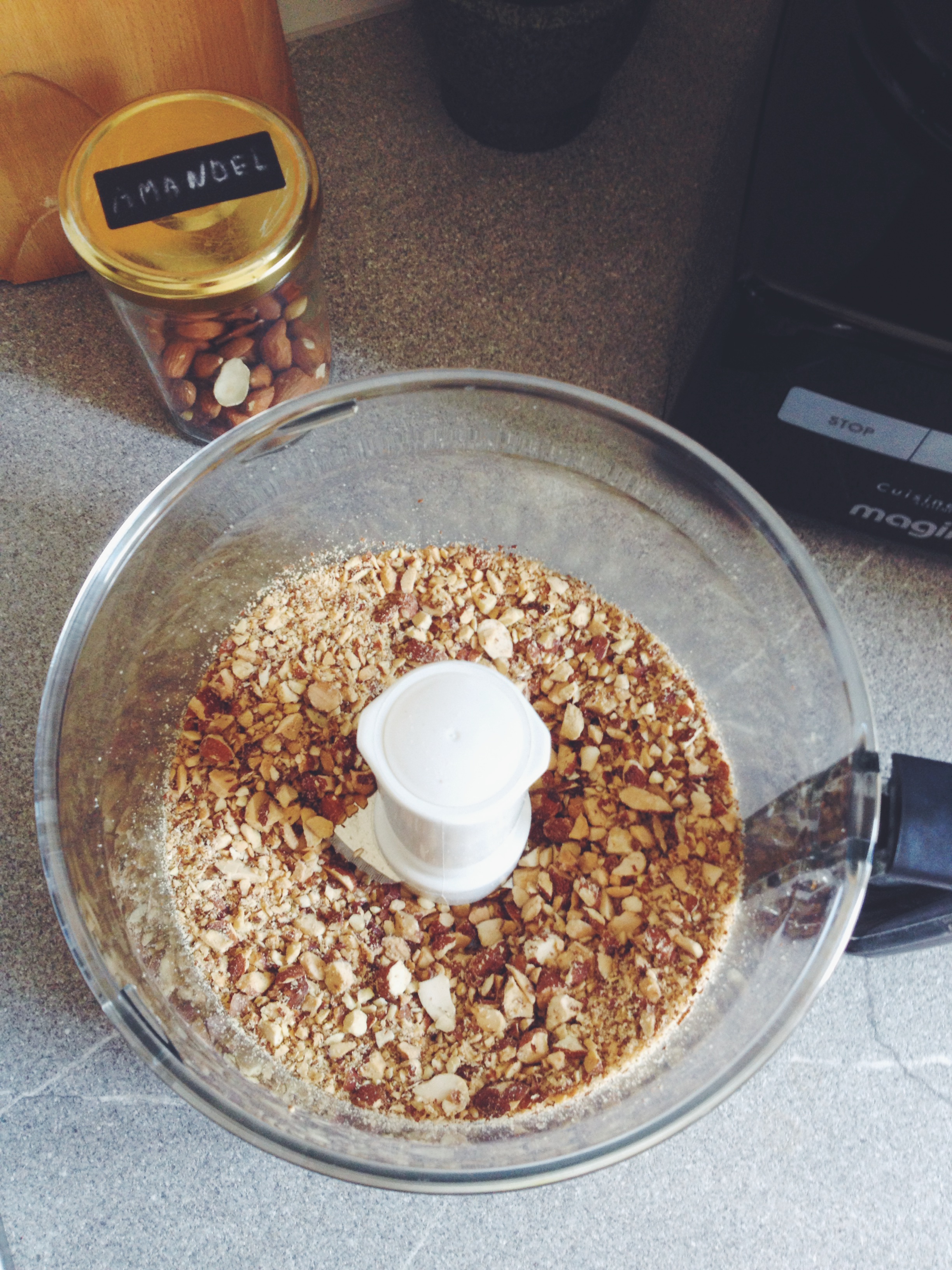 - laat de amandelen wat afkoelen en doe ze daarna (als ze nog een klein beetje warm zijn) in een keukenmachine