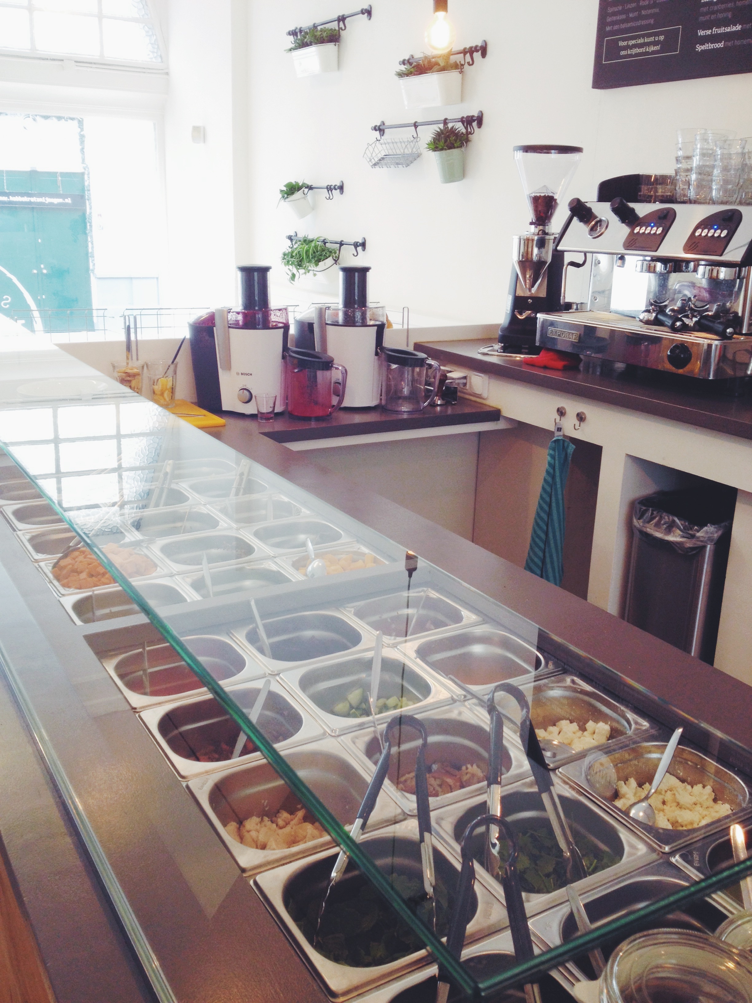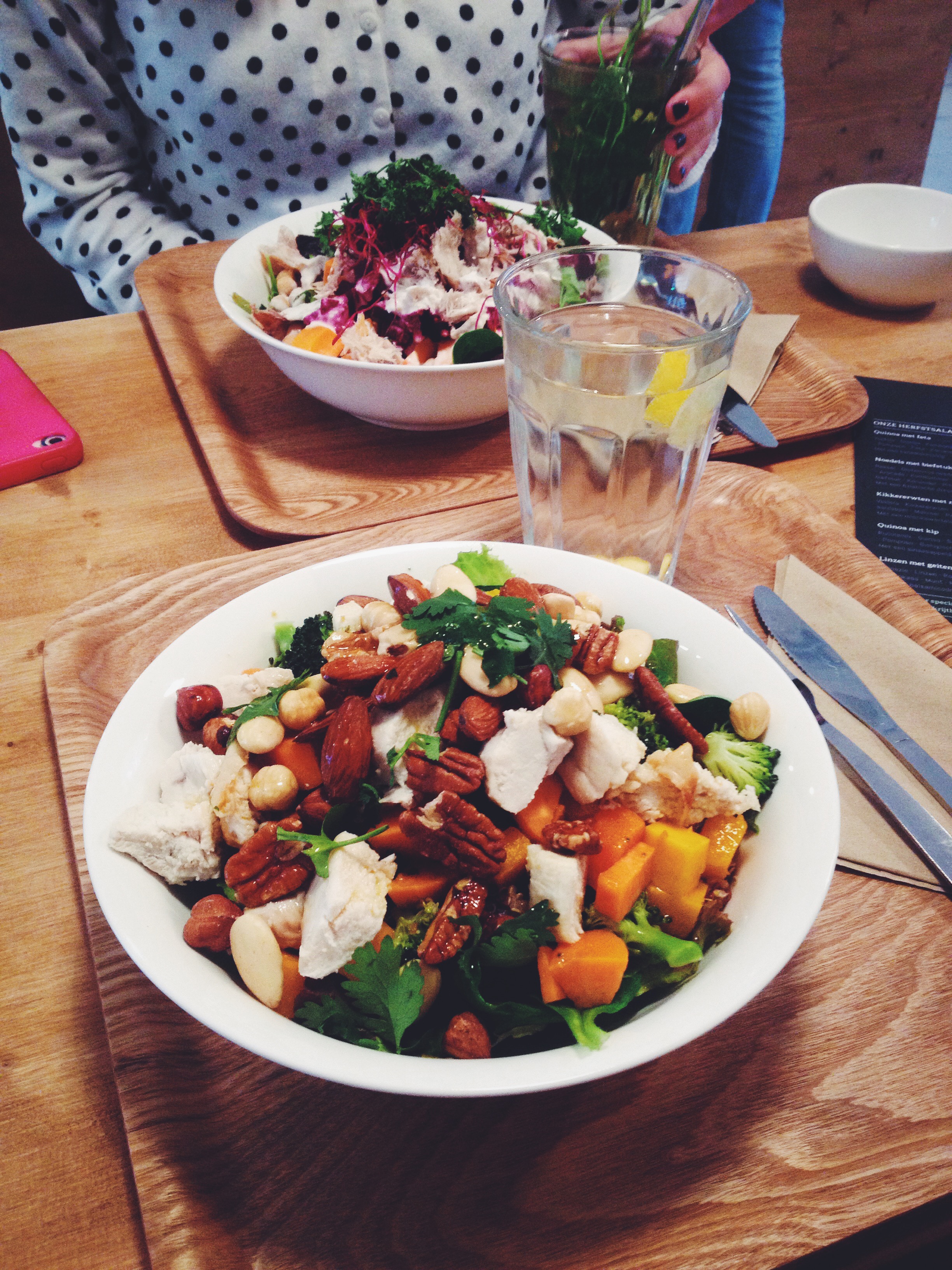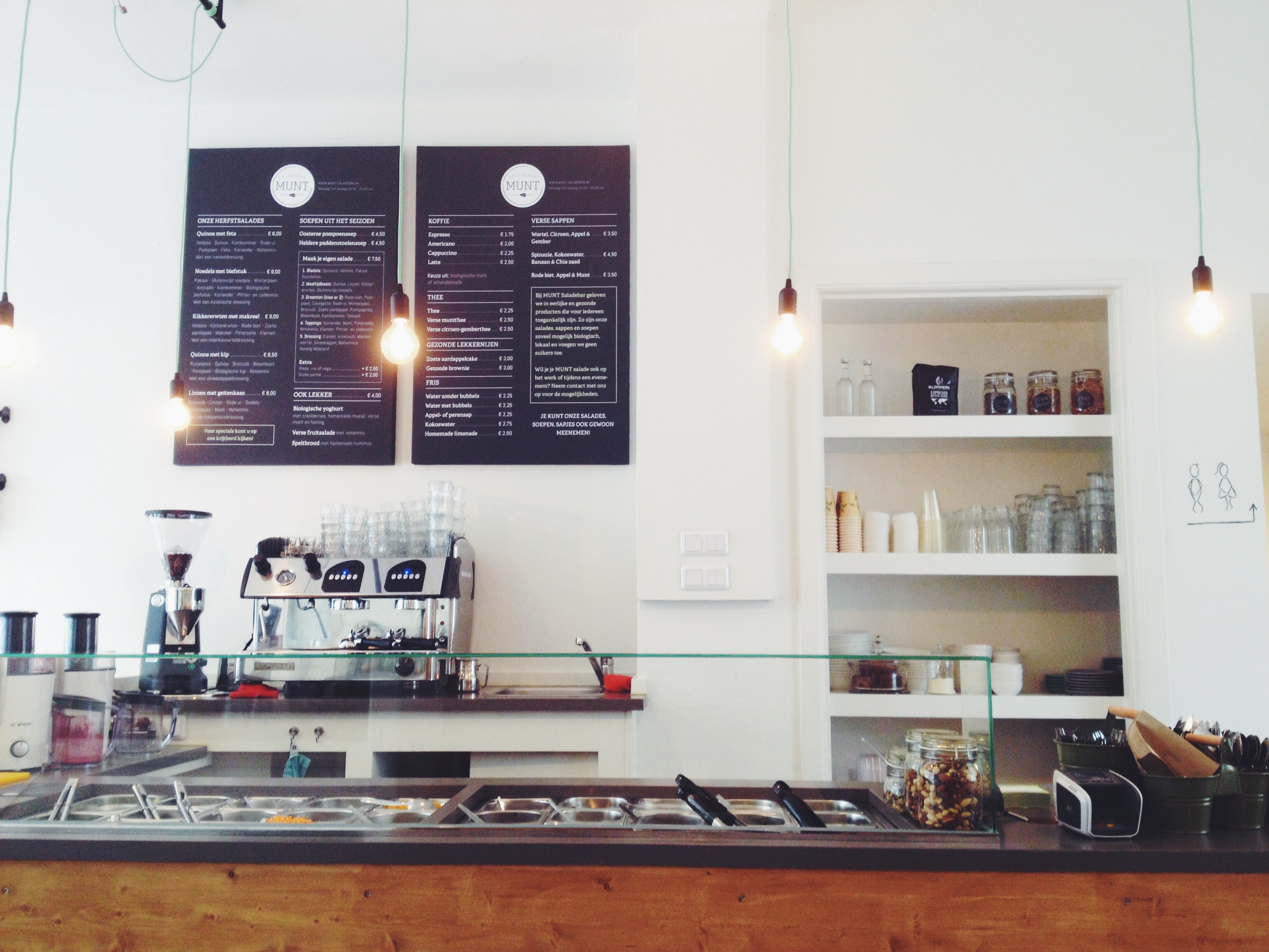 Nijmegen is een healthy hotspot rijker! Bij saladebar Munt draait namelijk alles om gezondheid; een plek naar mijn hart dus 🙂 Munt is opgericht door vriendinnen Laura Hendriks en Maaike Roelofs; twee doorpakkers met een passie voor gezonde voeding. Alles bij Munt is home made en de dames werken zo veel mogelijk met biologische en lokale producten. Ook voegen ze geen (geraffineerde) suikers toe. Je kunt voor samengestelde salades kiezen (zoals quinoa met kip of linzen met geitenkaas) of je kunt er zelf een samenstellen en trust me, er is keuze genoeg! Op de kaart vind je verder gezonde sapjes, soepen, smoothies, ontbijtjes (zoals speltbrood met hummus) en zoete lekkernijen (denk aan healthy brownies met courgette of zoete aardappelcake)! Alles wordt dus door de dames zelf gemaakt en dat maakt alles ook éxtra lekker! Mijn favorieten: het biet-appel-munt sapje, de gezonde brownie en de linzensalade met geitenkaas, dadels, munt en noten; heerlijk! De porties zijn ruim; écht waar voor je geld dus. Munt is gevestigd in het centrum van Nijmegen in een prachtig authentiek pand. Het interieur is sfeervol en modern met als pronkstuk de prachtige saladebar die doet denken aan een hippe hotspot in New York. Je kunt bij Munt ook afhalen en in de toekomst wordt er thuisbezorgd. Breng dus snel een bezoekje aan dé healthy hotspot van Nijmegen!