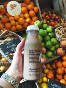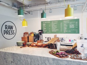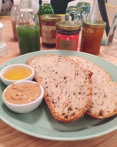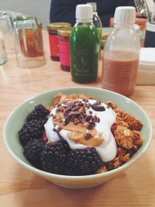 Op maandag was onze eerste stop Raw Press voor een lekker en gezond ontbijt. Raw Press is opgericht door 2 neven die zich specialiseren in de lekkerste en gezondste sapjes. Op Dover Street hebben ze sinds kort ook een prachtig cafe waar je kunt ontbijten en lunchen. Ik koos voor de Chocolate Mylk en voor het groenste sapje die ze hebben: de Super Green. Nog een plus: de sapjes zitten in leuke lichtgewicht glazen flesjes! Gelukkig was er voor Roy (die al bang was voor een overdaad aan ‘groen’ in de vorm van alleen maar rauw of worteltjes ;)) ook genoeg keus. Hij ging uiteindelijk voor geroosterd zuurdesembrood met jam, notenpasta en honing met een groen sapje. De notenpasta was zo lekker dat we hebben gevraagd wat voor pasta het precies was; het bleek te gaan om de cashewpasta van Meridian die verkrijgbaar is bij o.a. Wholefoods. Later die week hebben we een kiloverpakking (!!) meegenomen bij de Wholefoods en Roy heeft hier sinds we terug zijn alleen nog maar mee ontbeten haha 😉 Ook ik kreeg deze heerlijke cashewpasta op mijn acai-smoothie bowl. Verder zat er romige kokosyoghurt, bramen, home made granola en cacao nibs op: yumm!! Dit was zonder twijfel het lekkerste ontbijt deze week!