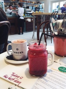 Op dinsdag hebben we bij Tanya’s geluncht; vooraf had ik al veel positiefs over deze Healthy Hotspot gelezen dus ik wilde er graag heen. De bar van Tanya’s ziet er prachtig uit en ook de gerechten zijn heel creatief. Alles hier is glutenvrij, geraffineerde suikervrij, zuivelvrij, vegan en rauw; zelf noemen ze het ‘living foods’. Ik koos voor een chai tea latte en samen met Roy deelde ik een My Glow smoothie. Roy koos voor de kebabs van champignons met amandel ‘sate-saus’; dat viel nogal tegen aangezien er welgeteld 3 champignons aan het stokje zaten.. Ik koos voor de rauwe nachos die gelukkig heerlijk waren en ook erg inventief gemaakt. Er zaten heerlijke dips bij: zure room van cashewnoten, hartige paddenstoelen-dip, guacamole en een ananas-salsa. Als toetje deelden we nog een heerlijk chocolade-blauwe bessen taartje. Alles wordt ook erg mooi opgediend. We vonden wel nogal prijzig. Toch is het een leuke beleving en ik had het niet willen missen!