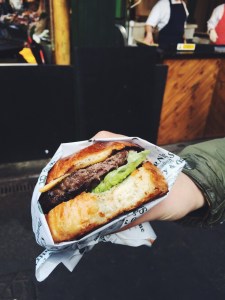 Na The Tower zijn we naar de Borough Market gelopen. Dit schijnt dé plek te zijn voor foodies. Persoonlijk vond ik dit een beetje tegenvallen, maar wellicht kwam dit omdat we op een woensdag waren. Wij vonden de Camden Lock markt leuker. Toch heb ik ook hier weer leuke dingen gezien en ik zou een bezoekje absoluut aanraden. Als lunch koos Roy op de Borough Market voor een sappige hamburger met cheddar en bacon-jam (wat dat ook mag zijn haha ;)) en ik voor en gluten- en geraffineerde suikervrije blueberry-muffin.