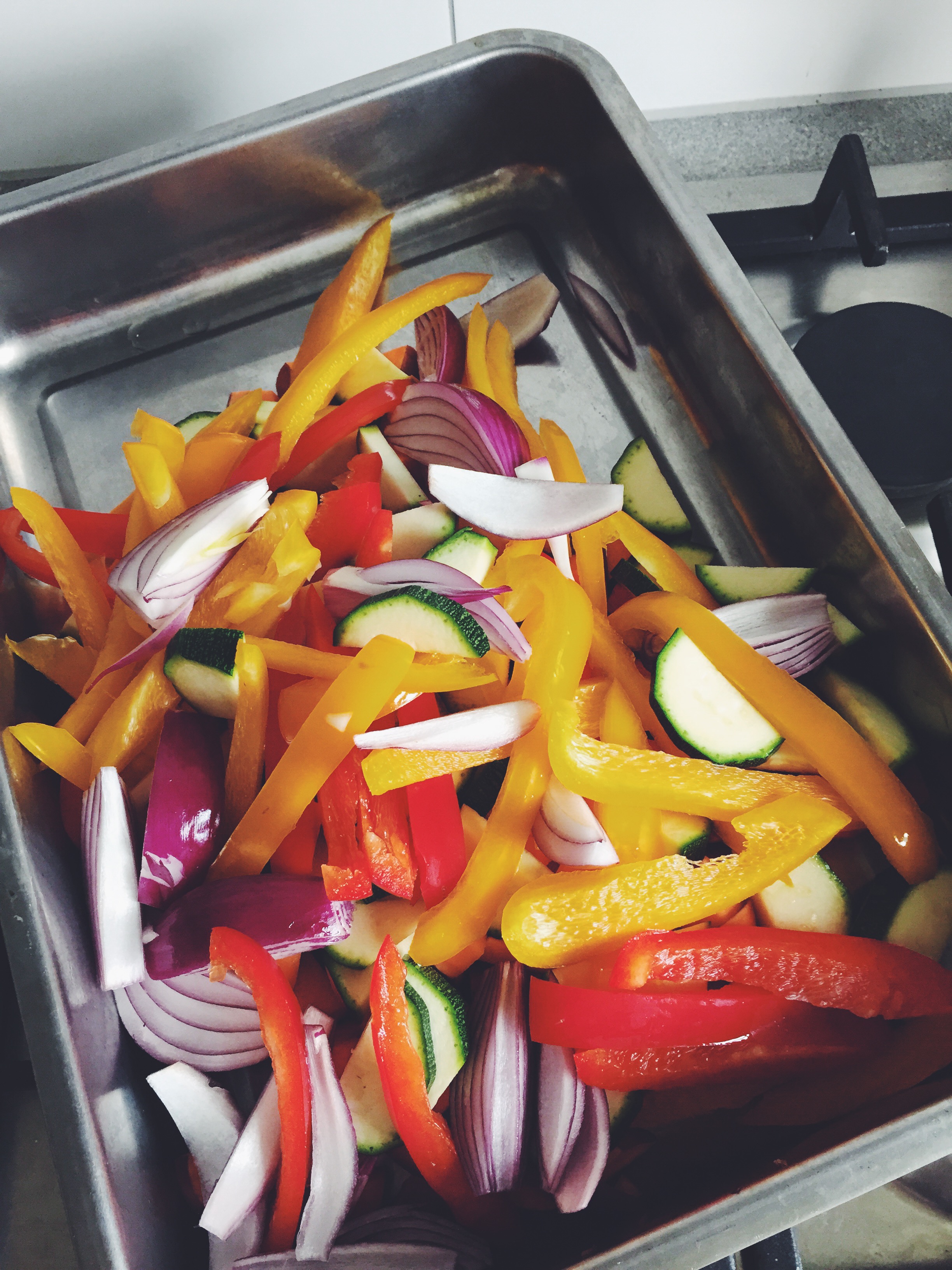 - Doe de groenten in een ovenschaal** en besprenkel met wat olijfolie/kokosolie, zeezout en peper