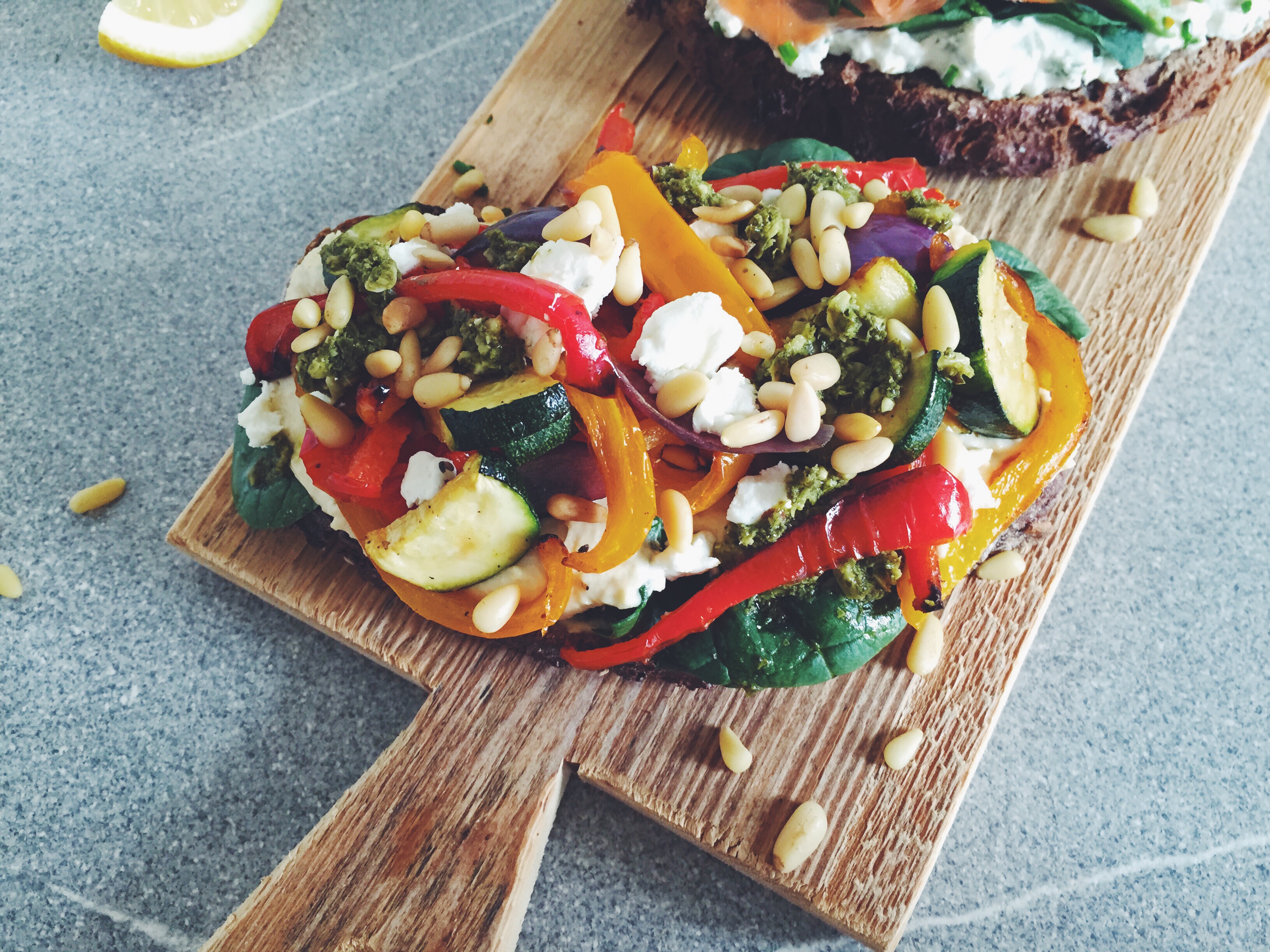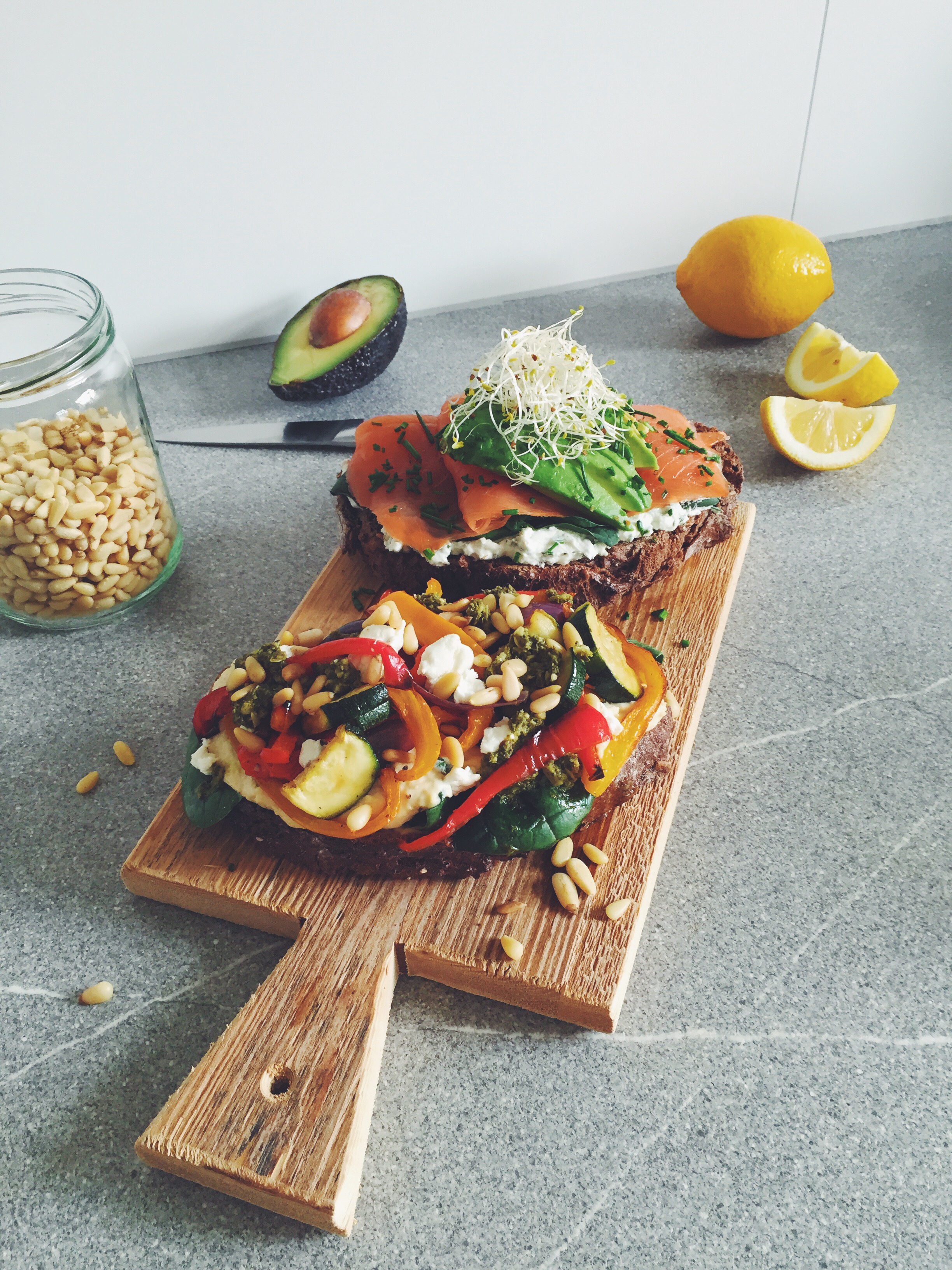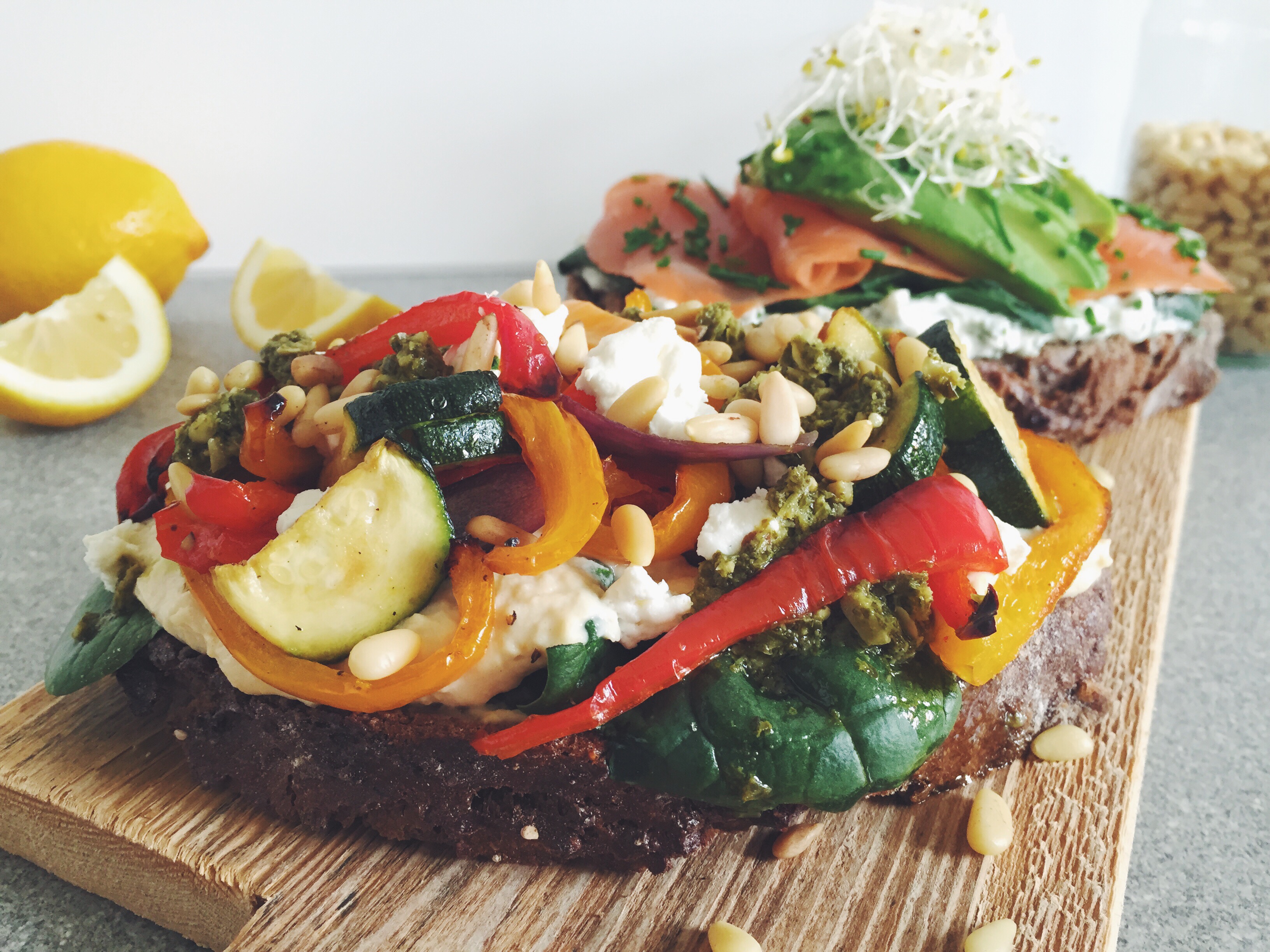 Wanneer ik brood eet, zorg ik er altijd voor dat het van goede kwaliteit is en beleg ik het met voedingsstofrijke producten zoals notenpasta, zalm, kiemen, geitenkaas, gegrilde groenten en humus. Vandaag deel ik 2 van mijn favoriete combinaties (de variant met humus is geïnspireerd op mijn favoriete salade van Bairro Alto :)).