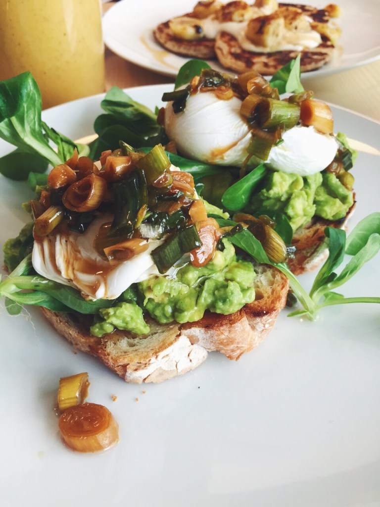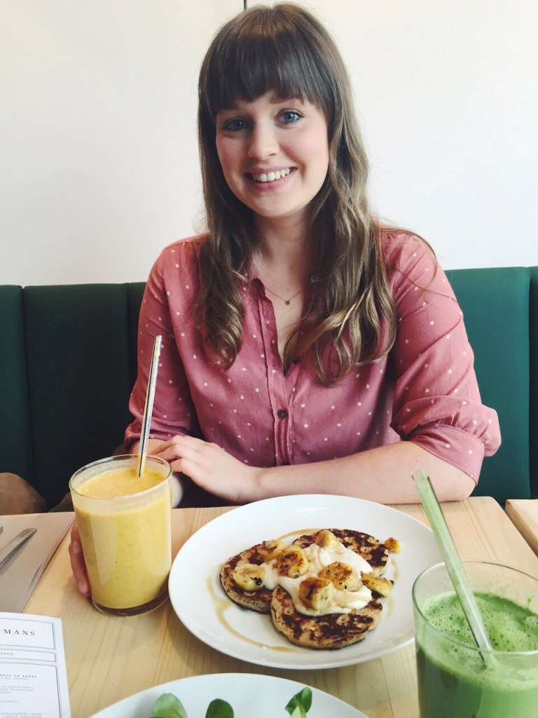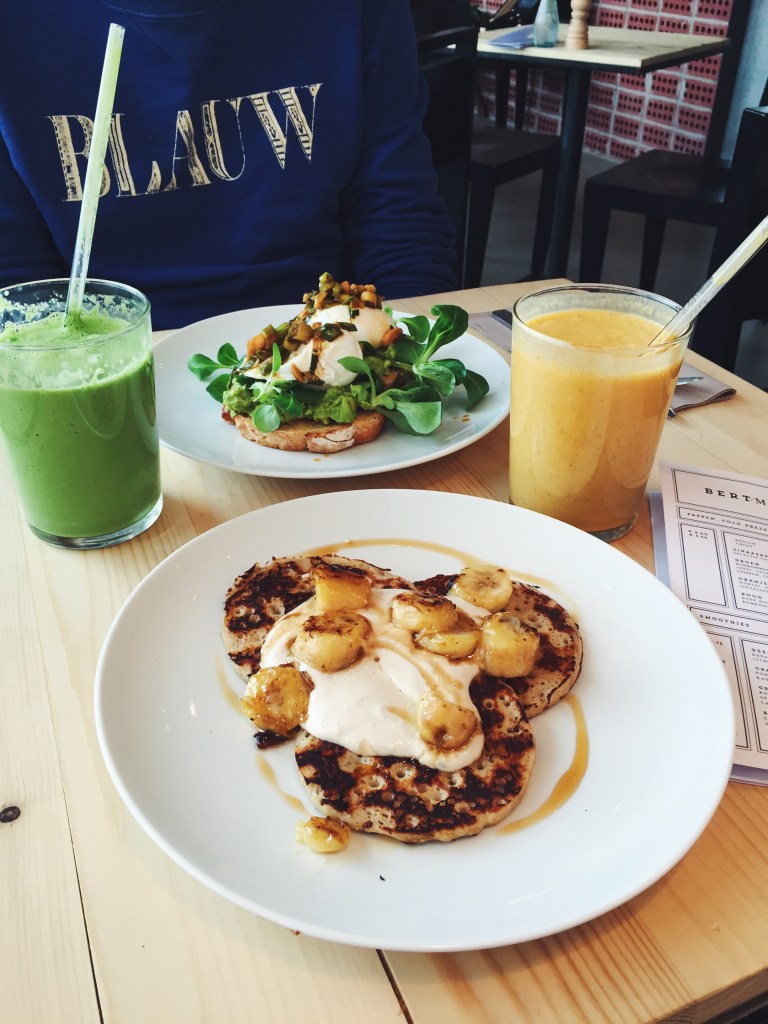 Ik kan je vertellen: het overtrof mijn verwachtingen! Roy ging voor geroosterd speltbrood met avocado, lente-ui, gember & gepocheerde eieren en een groene smoothie (met o.a. komkommer, cashewnoten & basilicum) en ik (als échte pannenkoeken-liefhebber ;)) kon het niet laten om de boekweitpannenkoekjes met banaan & cashew whipped cream te kiezen. Daarbij dronk ik een pompoen-chai smoothie; yumm! We hebben echt enorm zitten smullen!