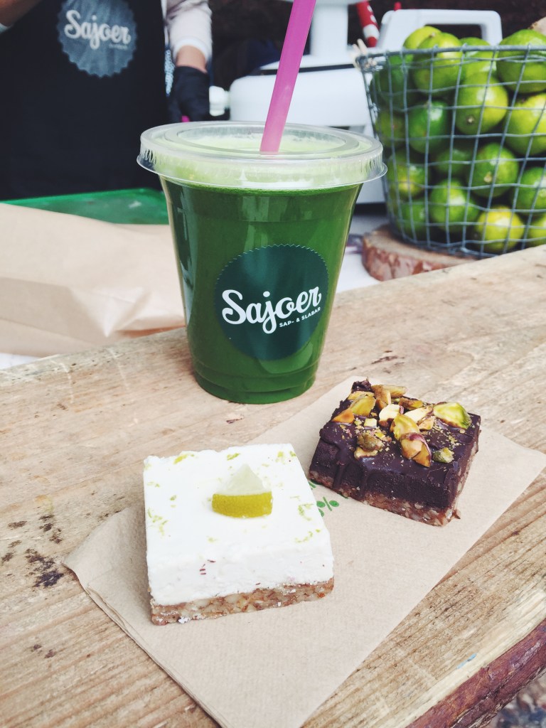 Ze verkopen bij Sajoer ook de overheerlijke (vegan, raw, gluten- & suikervrije) gebakjes van Sue; die moesten natuurlijk ook even getest worden 😉 Ik ging voor de Key-Lime variant en Roy ging voor Choco-Avo-Pistache. En lékker dat die zijn!