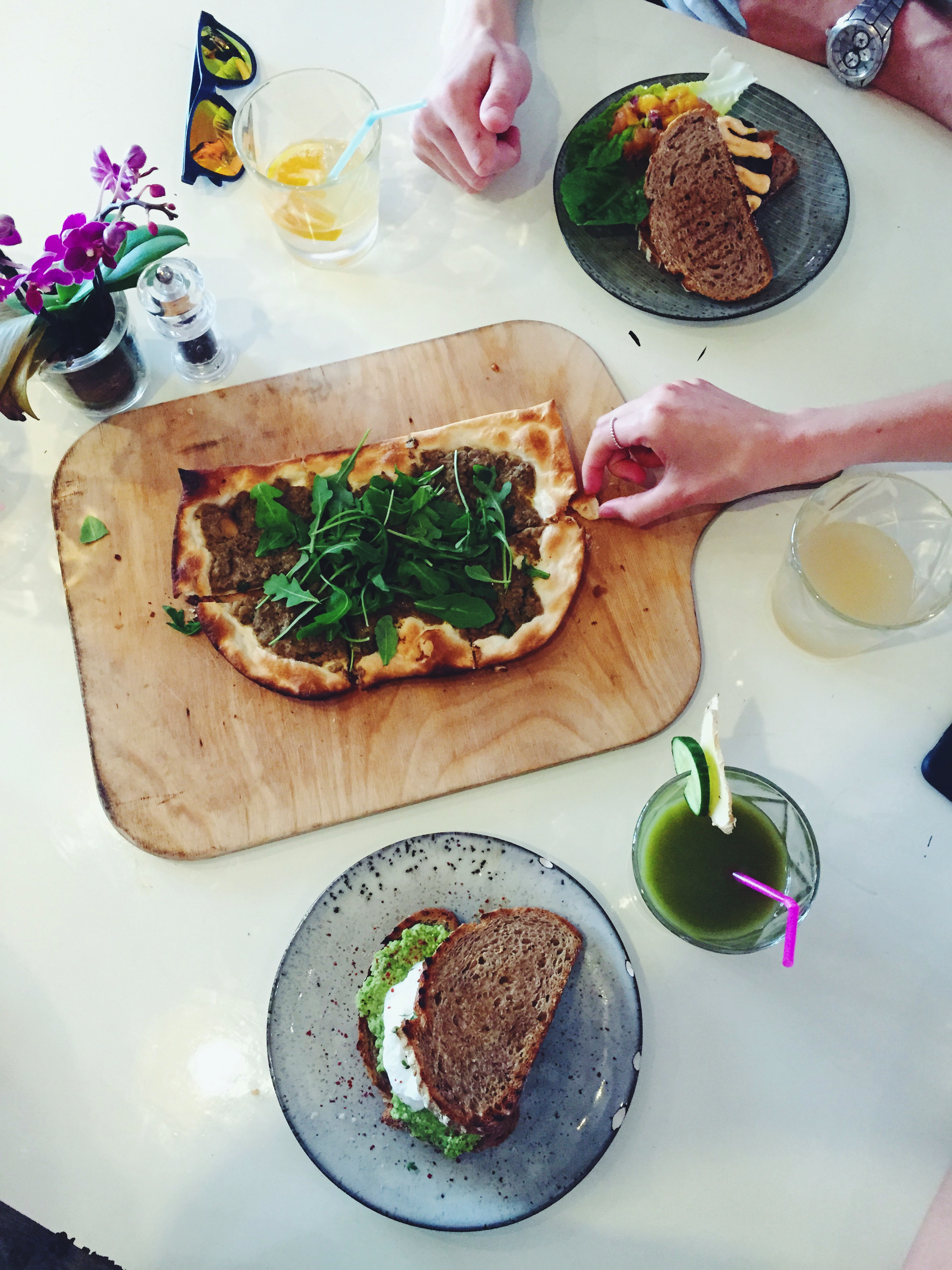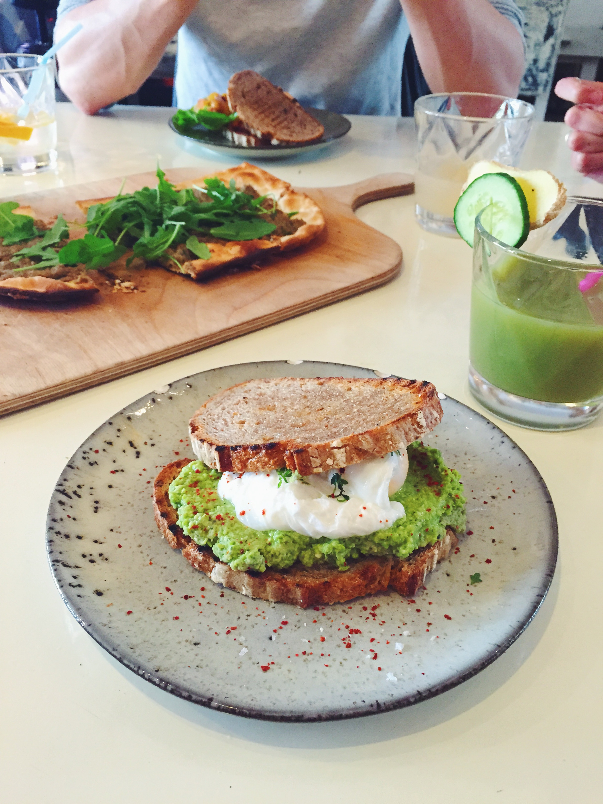 Samen met mijn vriend, mijn zus en haar vriend hebben we een paar gerechtjes gedeeld. We bestelden een spelt-pizetta met paddenstoelen, truffel & rucola, een Portobello burger met huisgemaakte kimchi en zuurdesembrood met smashed tuinbonen, feta, munt & een gepocheerd eitje. Ik dronk er een home made chai latte met amandelmelk bij; heerlijk!