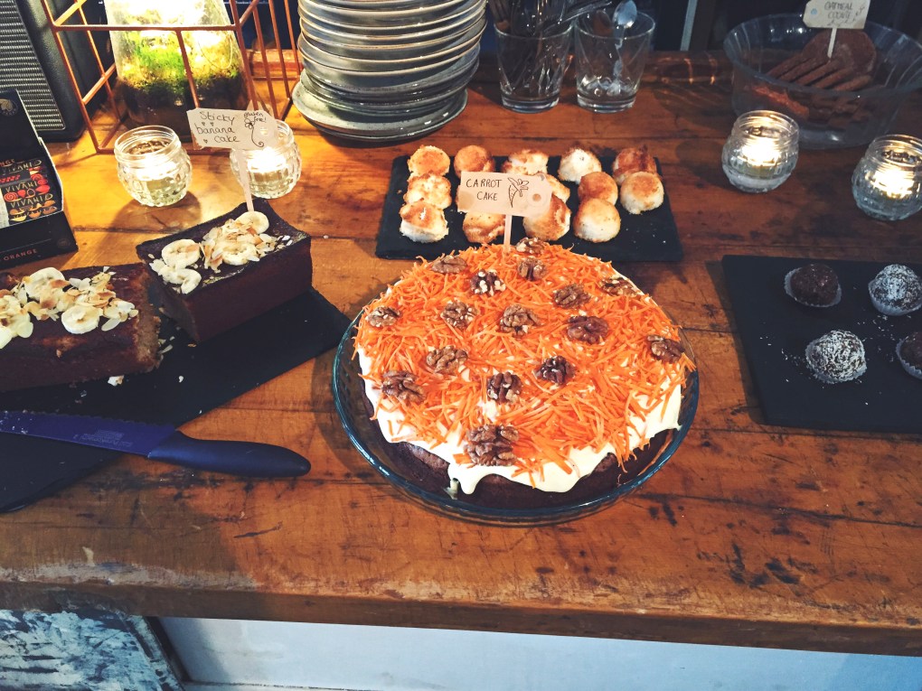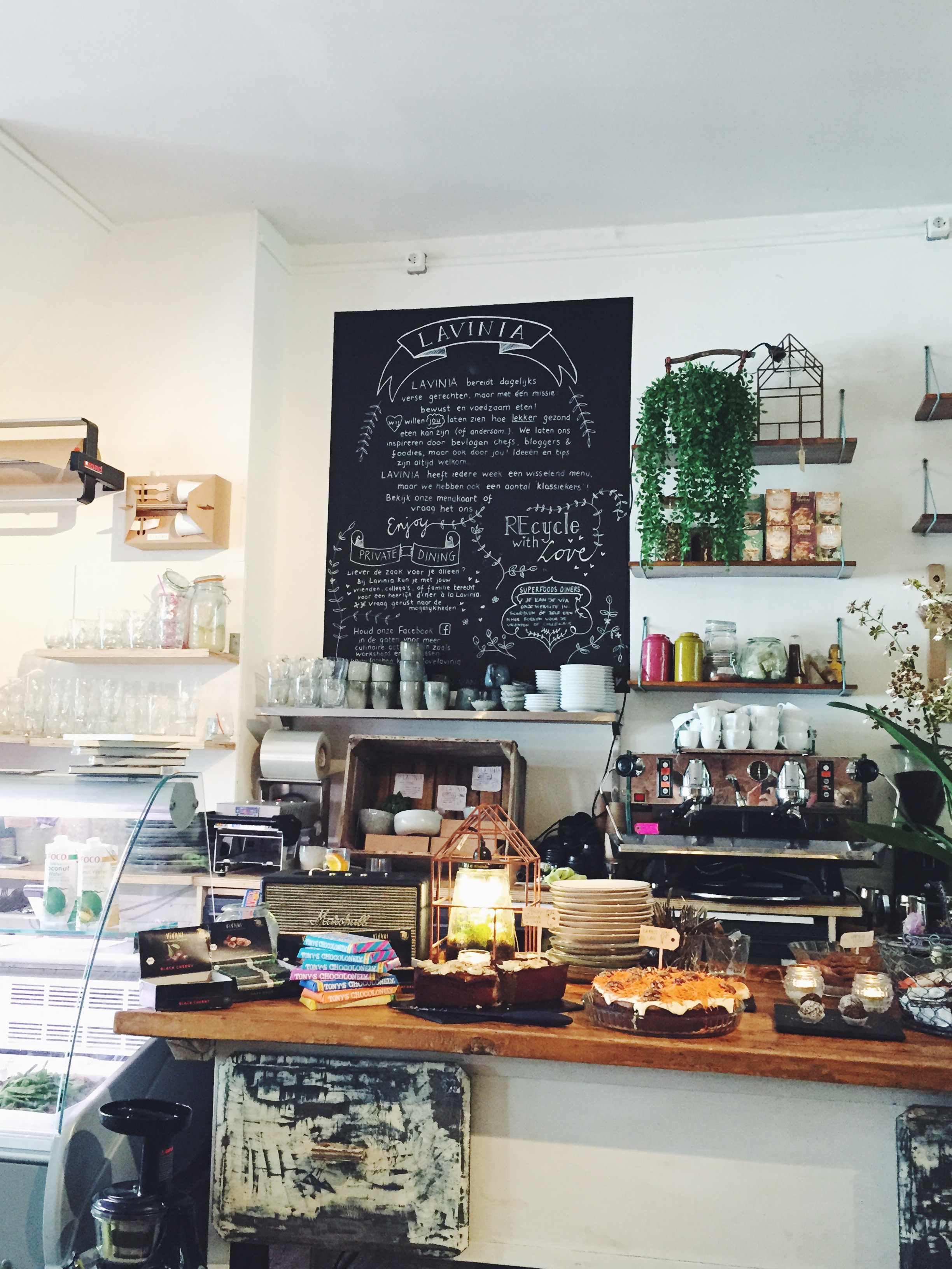 Verder staan er verschillende sapjes (veggie cocktails genaamd) op de kaart en ook de taartjes en het bananenbrood zagen er heerlijk uit! Veel van de zoete lekkernijen die je bij Lavinia kunt kopen zijn vegan, suiker- en/of glutenvrij. Daarnaast kun je tussen 12.00 en 16.00 uur kiezen uit verschillende salades. Helaas waren we te laat voor de ontbijtkaart want die zag er ook wel hééél erg goed uit met onder andere kokosyoghurt met home made granola & rabarber, havermout met amandelmelk & kurkuma of wentelteefjes met palmsuiker & vers fruit… Een goede reden om nog maar een keer terugkomen dus! 😉