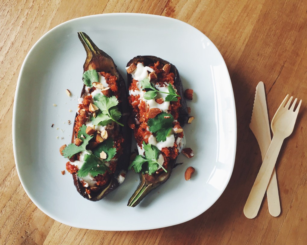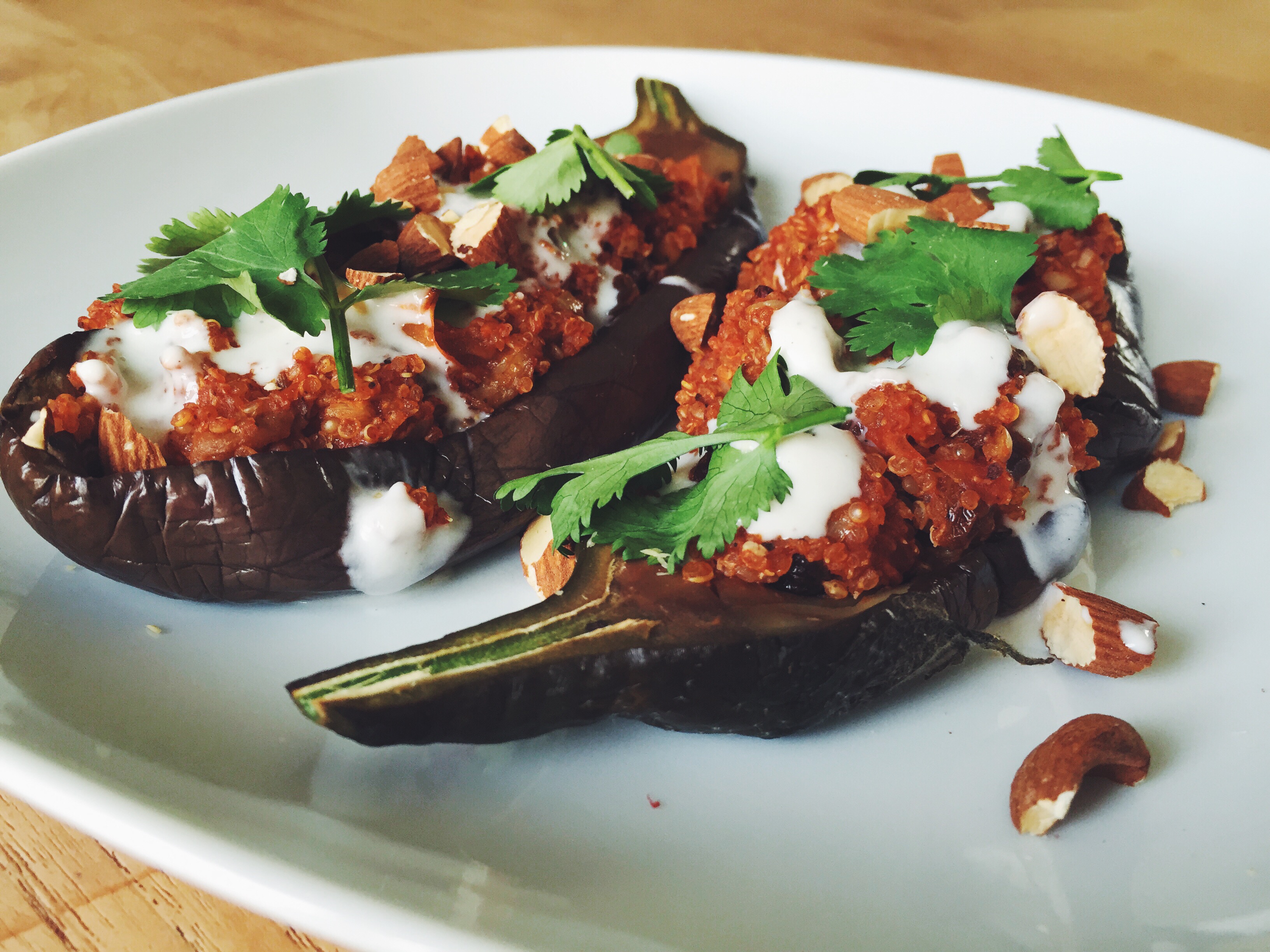 Zoals ik in een vorige blog beschreef heb ik laatst een super gezellige kookdag gehad met Alexa van Abbot Kinney’s. Voor dit fijne kokosyoghurt merk heb ik een aantal recepten ontwikkeld. Deze recepten staan op de website van Abbot Kinney’s en ik zal ze ook hier delen. Deze week allereerst deze aubergines gevuld met Indiaas gekruide quinoa waar het verkoelende kokosyoghurt-tahin sausje perfect bij past.