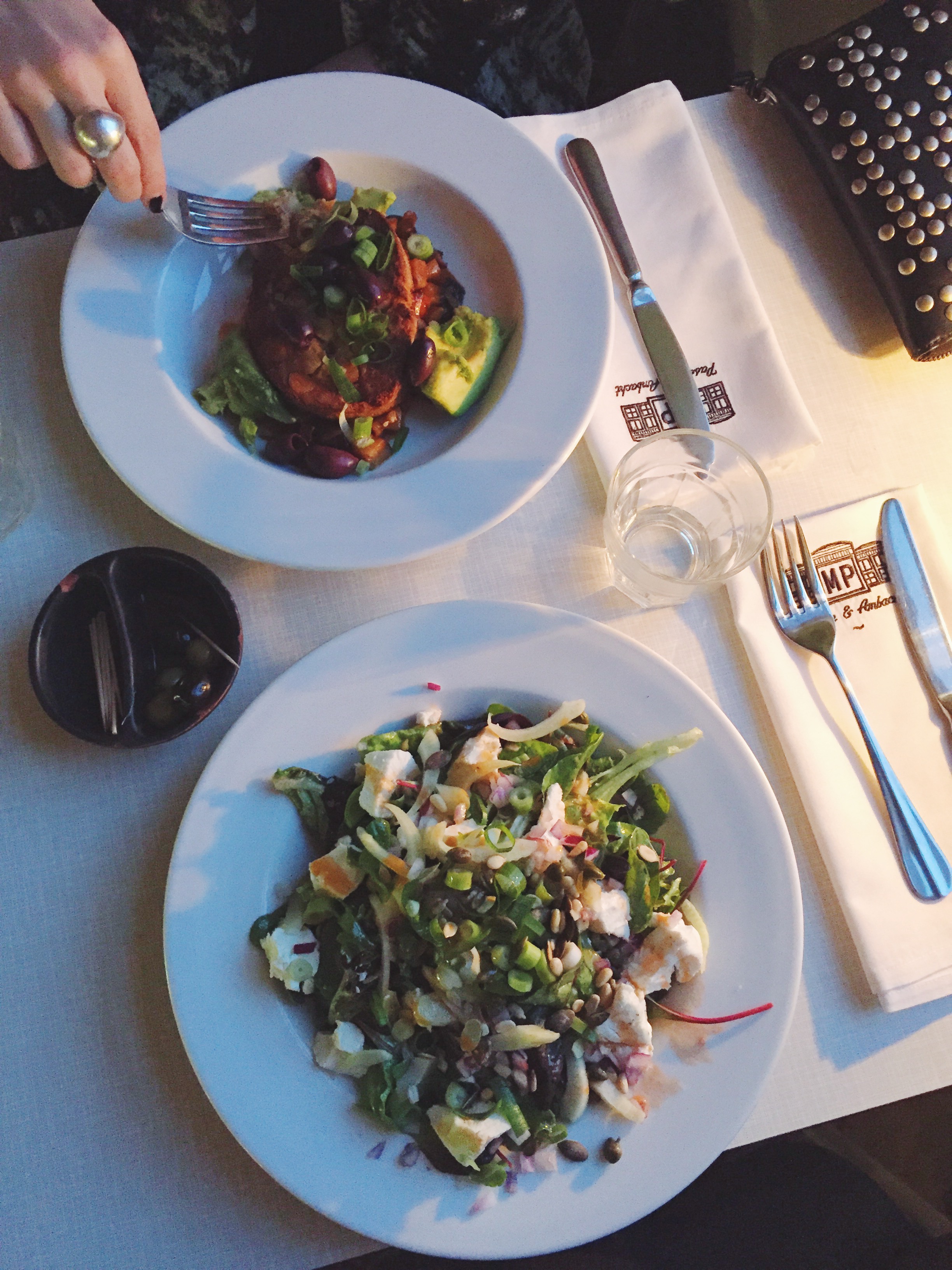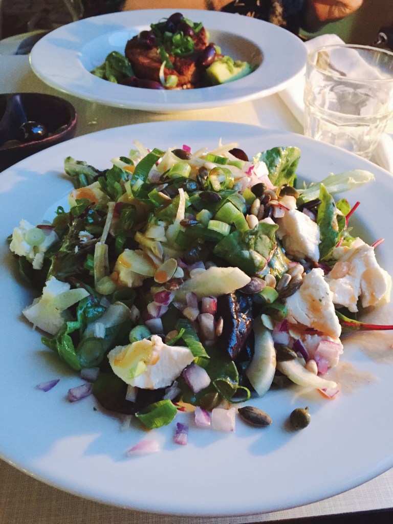 Vooraf kregen we een heerlijke pompoensoep met bieslook en pitjes. Als hoofdgerecht koos ik voor een vegetarische salade met geitenkaas (en slabonen, geroosterde bieten, paprika, venkel, gekarameliseerde ui & aceto-tomaat vinaigrette). Suzanne ging voor een meatza: een soort pizzabodem van kip met kikkererwten, geroosterde paprika, aubergine, courgette en avocado. Er stond ook nog een visgerecht op de kaart; meer dan genoeg keus dus.
