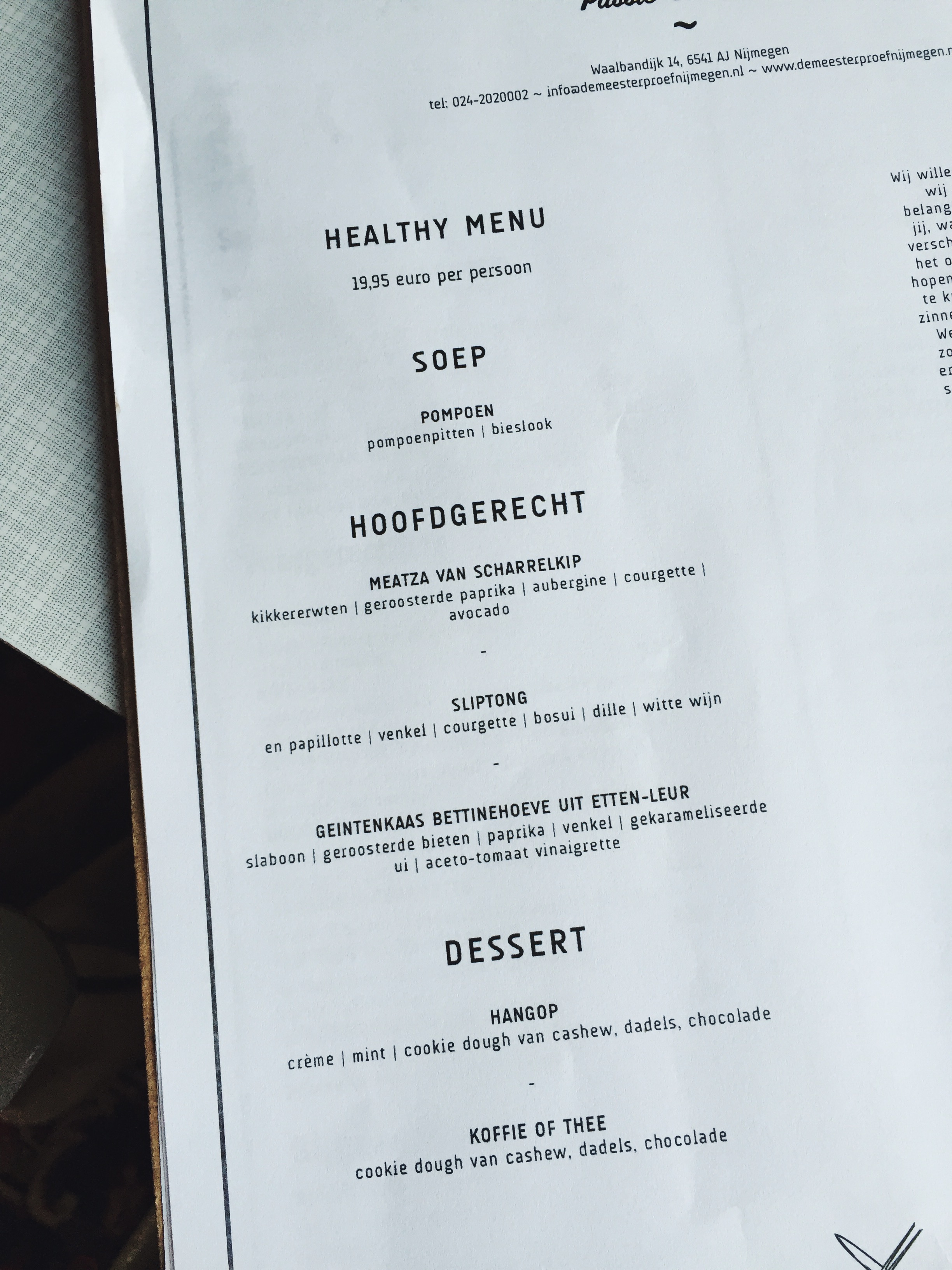 Samen met Suzanne van Puur Suzanne (je kent haar leuke website hoogstwaarschijnlijk al wel, zo niet neem dan zeker eens een kijkje!) heb ik op uitnodiging gegeten bij de Meesterproef in Nijmegen vanwege hun nieuwe healthy menu. Al eerder schreef ik een blog over de Meesterproef; maar deze nieuwe extra gezonde route die ze zijn ingeslagen verdient extra aandacht.