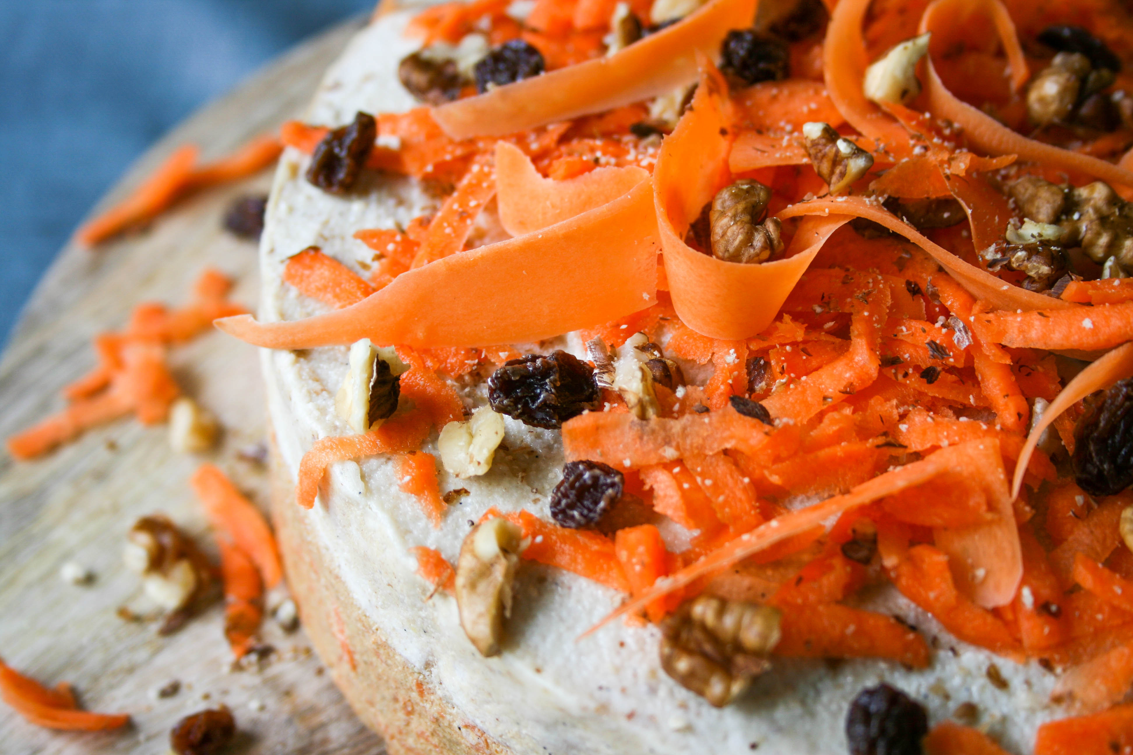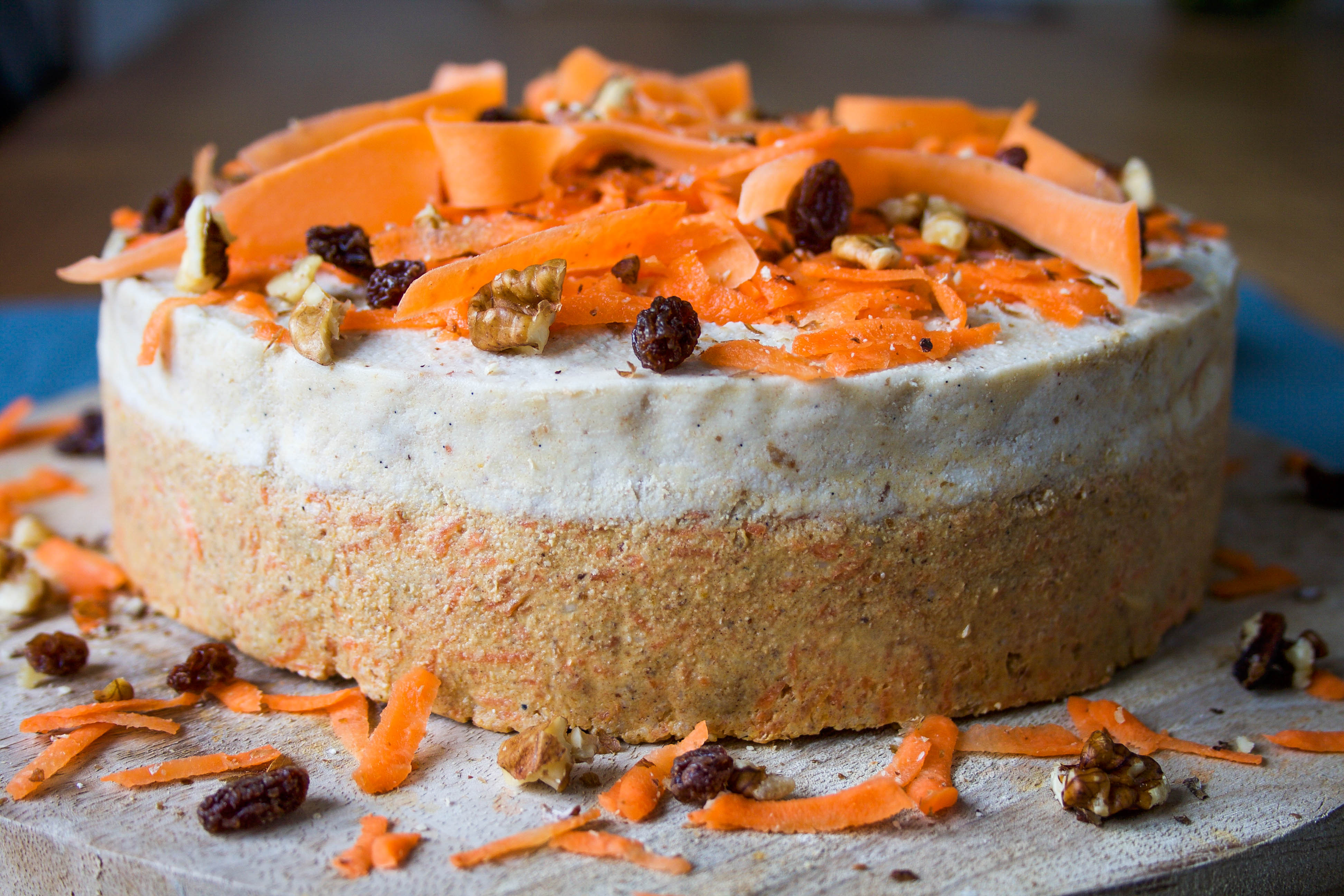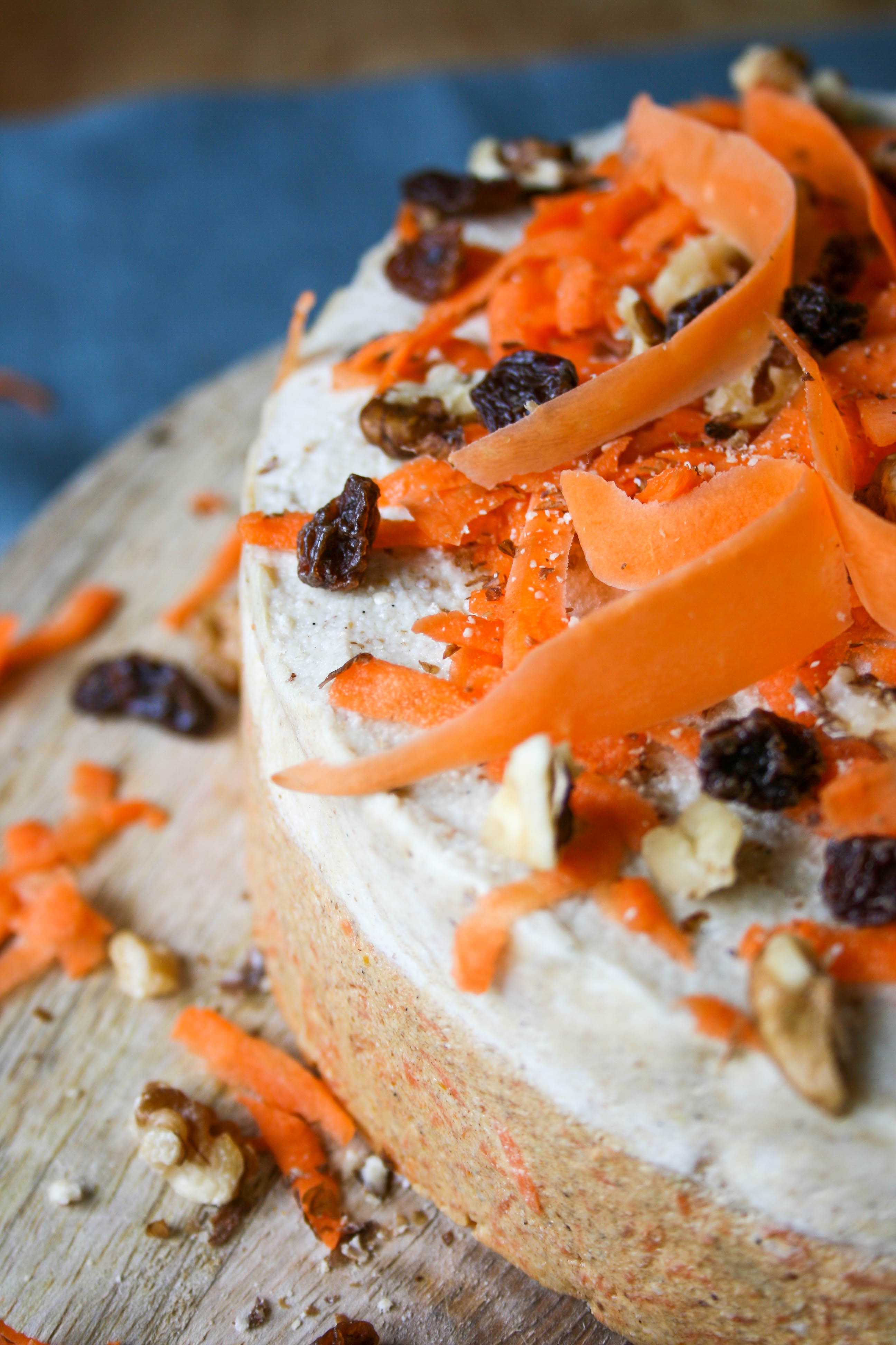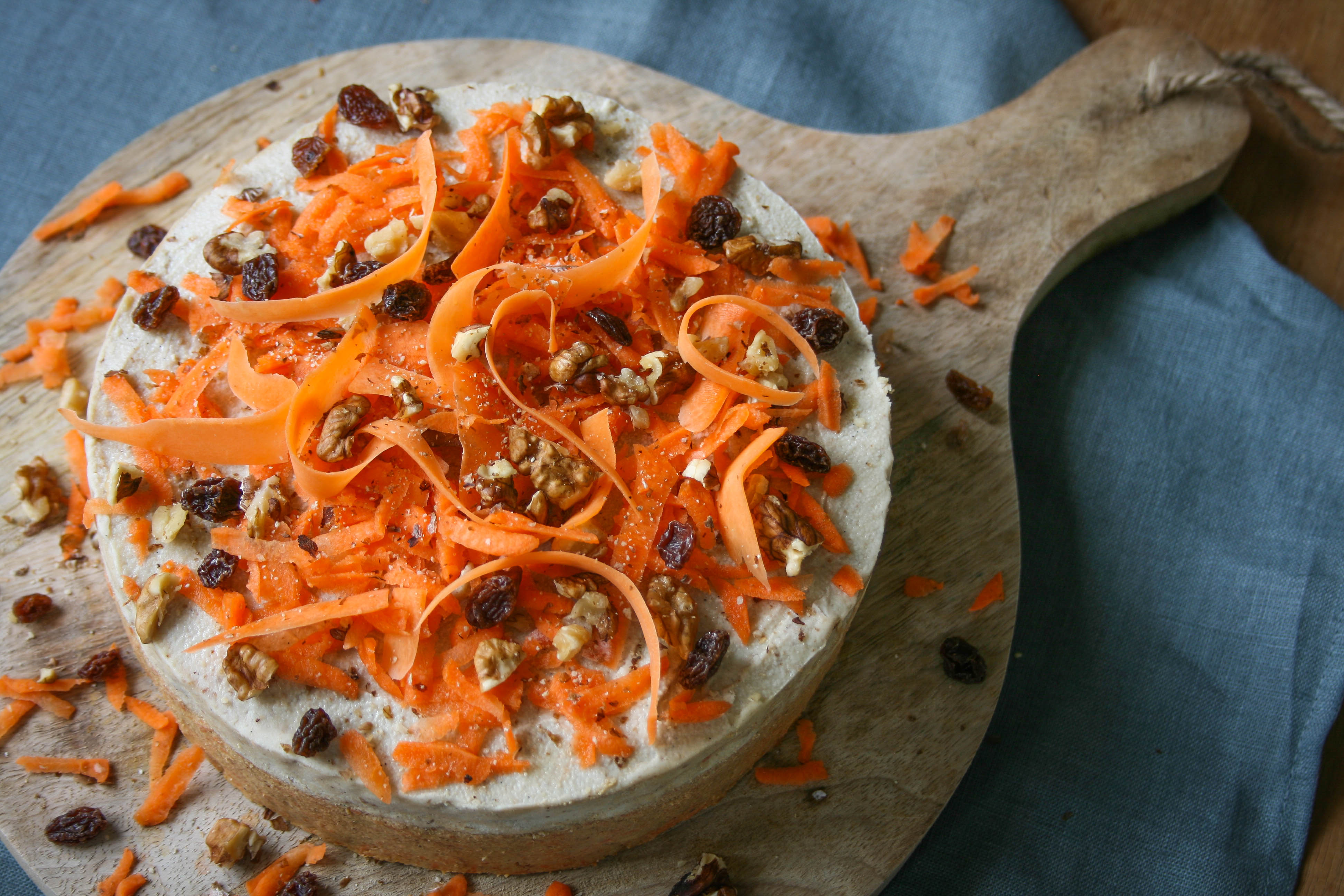 7. Verdeel de cashew-cream gelijkmatig over de carrot-cake laag. Je kunt de taart zo eten maar het is nog lekkerder om de taart nog even terug in de vriezer of koelkast te zetten om verder op te stijven.
