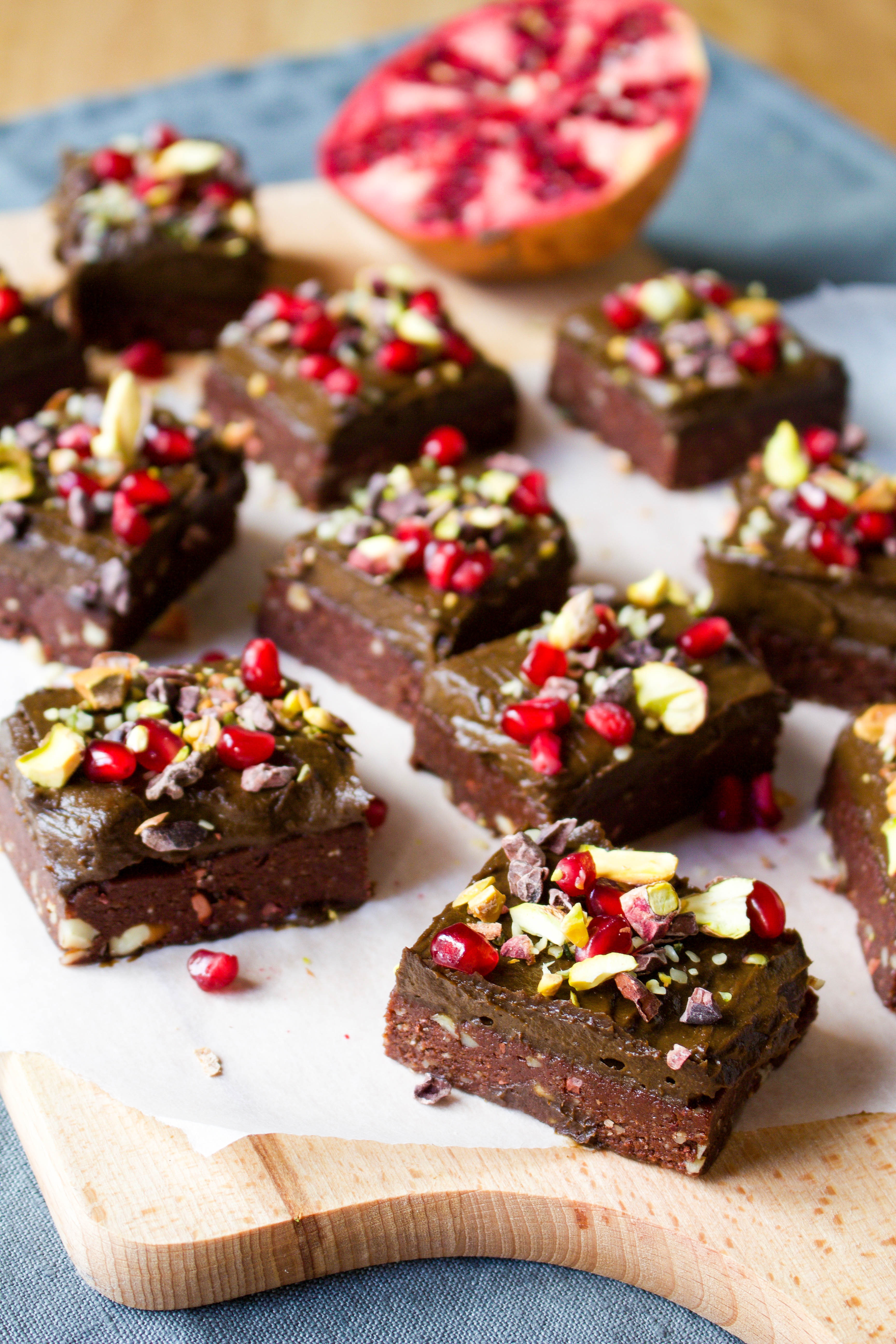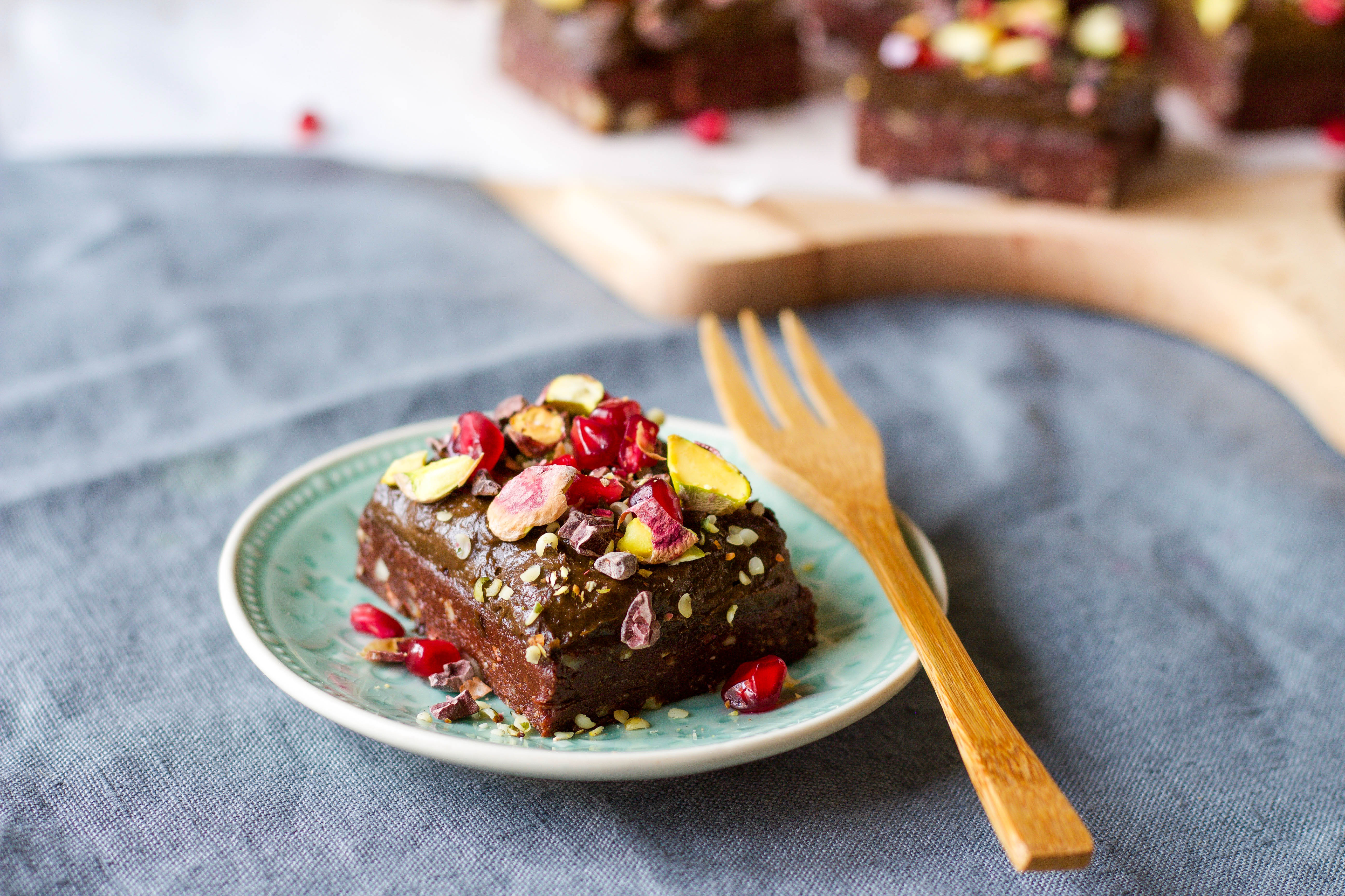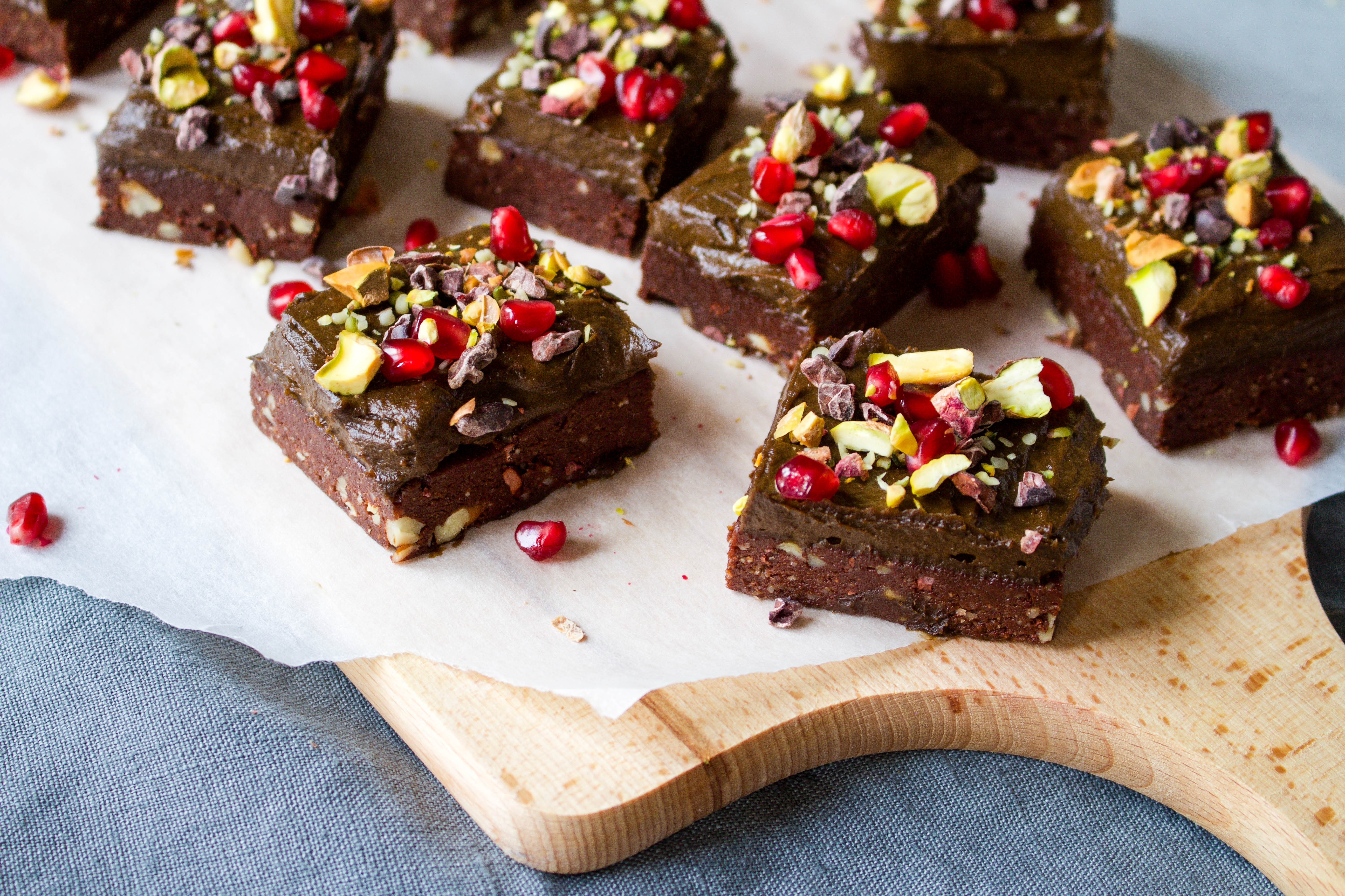 Deze brownies (die ik maakte & fotografeerde voor EkoPlaza) zijn vegan & raw want ze bestaan volledig uit noten en medjoul dadels. Daarmee zijn ze ook vrij van gluten en geraffineerde suiker. De zachte, kleverige Medjoul dadels zorgen voor binding en een zoete, karamelachtige smaak. De cacao nibs en stukjes pecannoot geven crunch en de romige chocolade-avocado topping maakt ‘m af. Ideaal om jouw valentijn mee te verassen!
