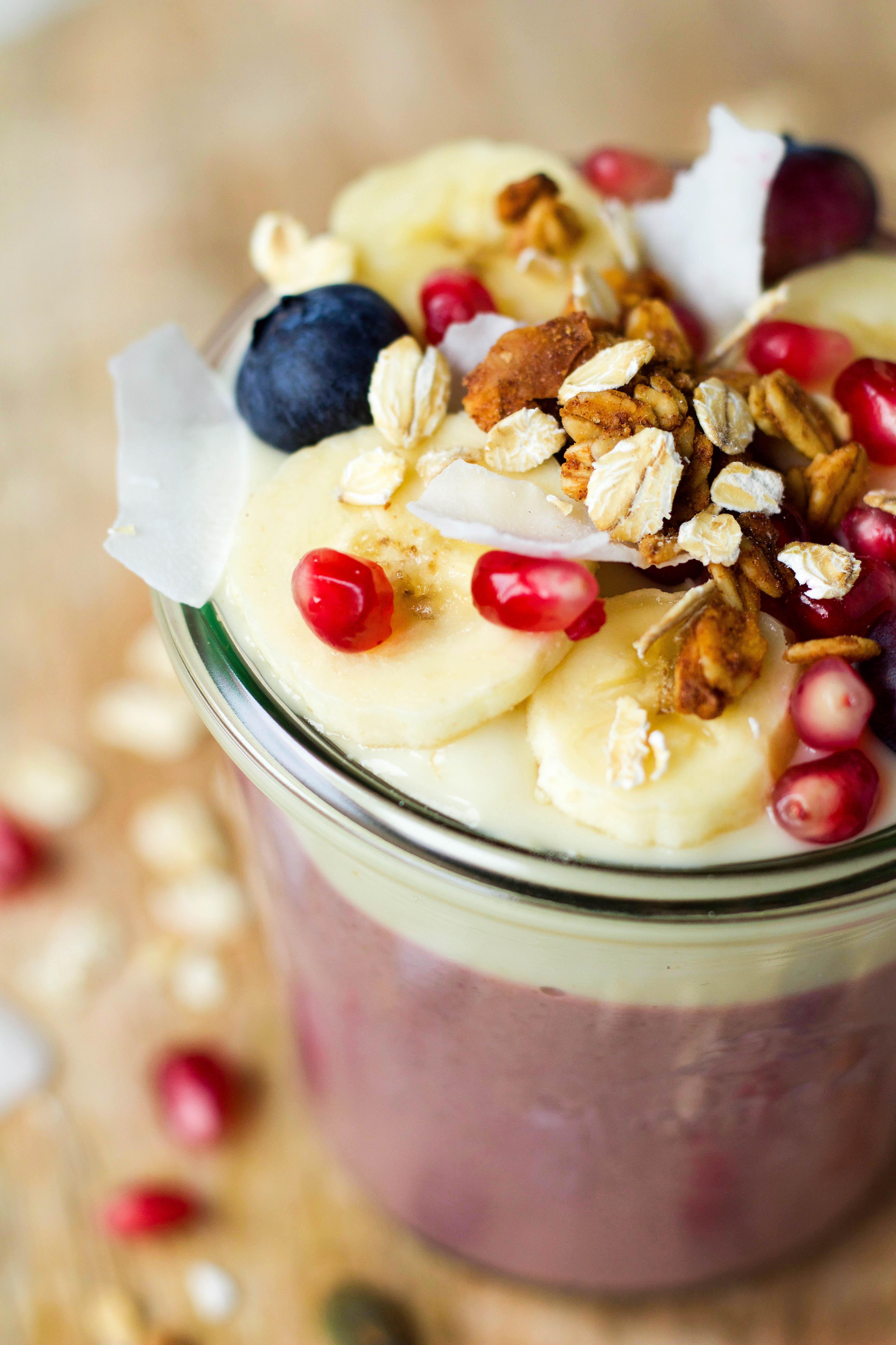 - Doe de açai smoothie in een pot (met deksel), bedek met een laag van de haveryoghurt en eindig met toppings naar wens. Schroef de dop op de pot en bewaar je ontbijt in de koelkast.