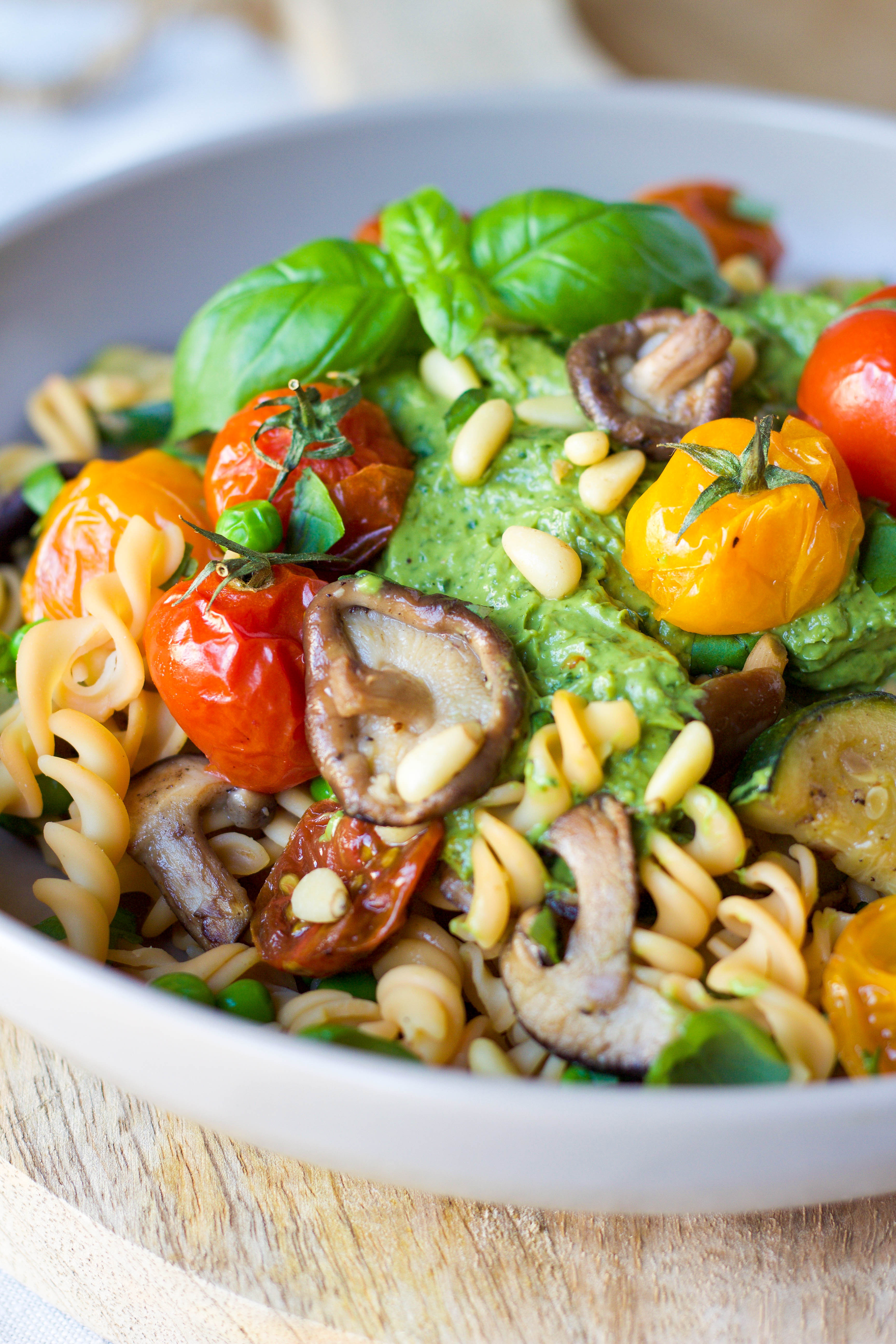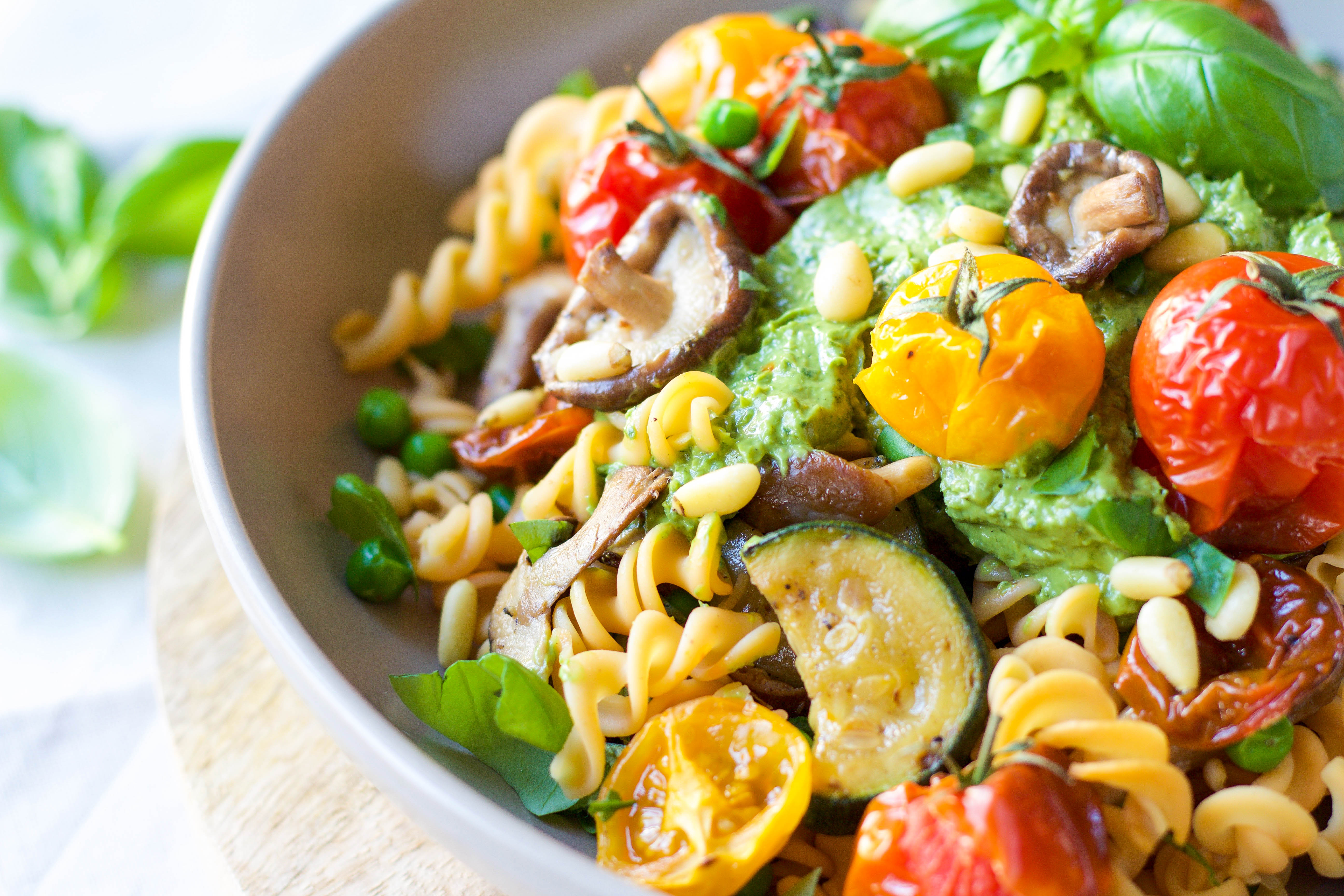 Genoeg groenten eten was nog nooit zo gemakkelijk! Dit pastagerecht zit namelijk bomvol groente en is ook heel rijk aan vezels. De pasta zelf bevat een geheim ingrediënt; namelijk rode linzen. En dat zou je niet zeggen want deze pasta is niet van ‘echt’ te onderscheiden! Rode linzen zitten bomvol plantaardige eiwitten, vezels en ijzer. Een ideale toevoeging aan een vegetarische maaltijd! Je kunt deze pasta vinden bij o.a. EkoPlaza. De avocado geeft de pestosaus romigheid en voegt een flinke portie broodnodige gezonde vetten toe aan het gerecht. Op zoek naar een pastagerecht zonder opgeblazen buik of after-dinnerdip als gevolg? Dan is dit een recept voor jou!
