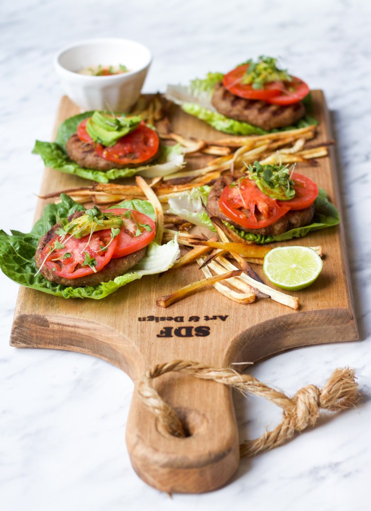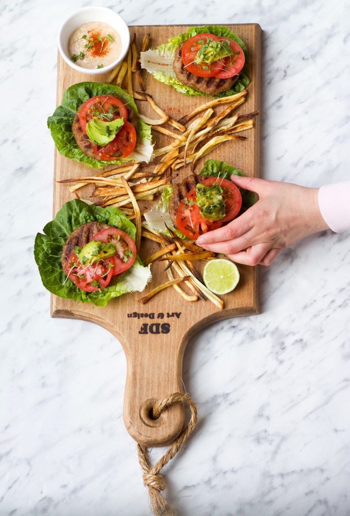 - Leg onder elke burger 1 of 2 blaadjes gem lettuce en beleg de burgers met toppings naar keus. Serveer de burgers met de pastinaak frieten en de tahin-saus. Extra leuk om de burgers en friet te serveren op een stoere, grote houten plank (zoals op de foto).