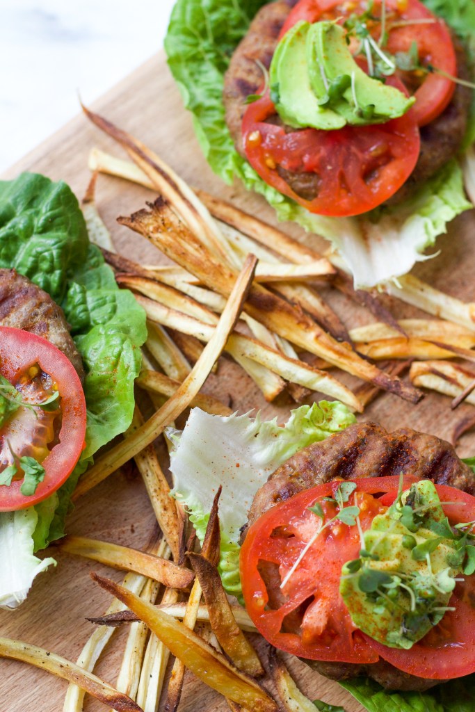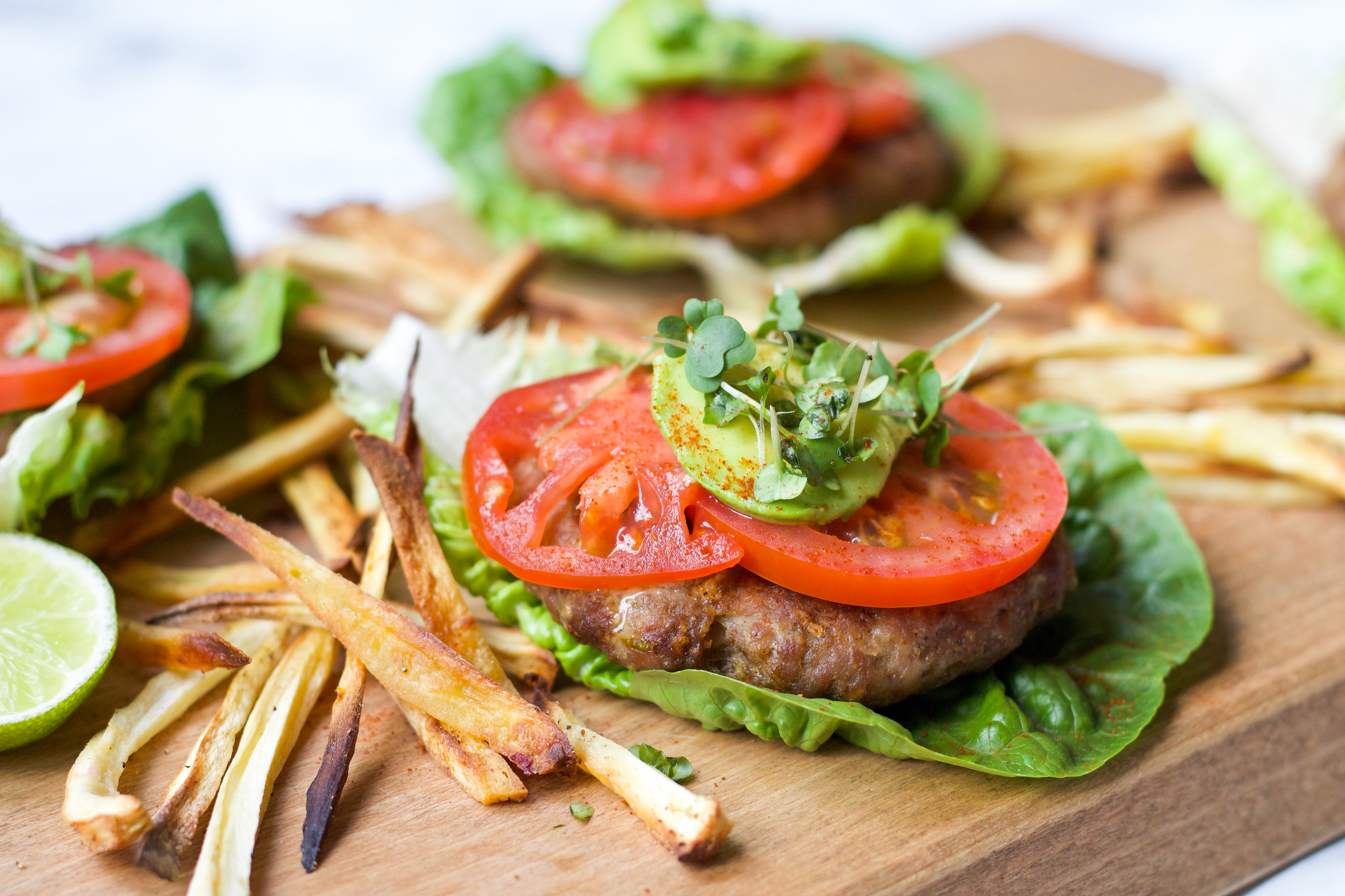 Wie houdt er niet van een goede burger op z’n tijd?! Deze is op basis van kalkoen. Lekker ter afwisseling! Kalkoen is daarnaast rijk aan eiwitten, selenium, zink en de vitamines B12 en B6. Ook zit het aminozuur tryptofaan in kalkoen; dit helpt bij een goede nachtrust. Dit is sowieso een lichtere variant op een ‘gewone burger’ doordat ik het broodje heb verruild voor knapperige blaadjes gem lettuce. De sauzen heb ik gewisseld met een heerlijke (calciumrijke) tahin-saus die rokerig smaakt door het gerookte paprikapoeder. De friet bevat éxtra veel vitamines, mineralen en vezels omdat ik pastinaak heb gebruikt. What’s not to love?
