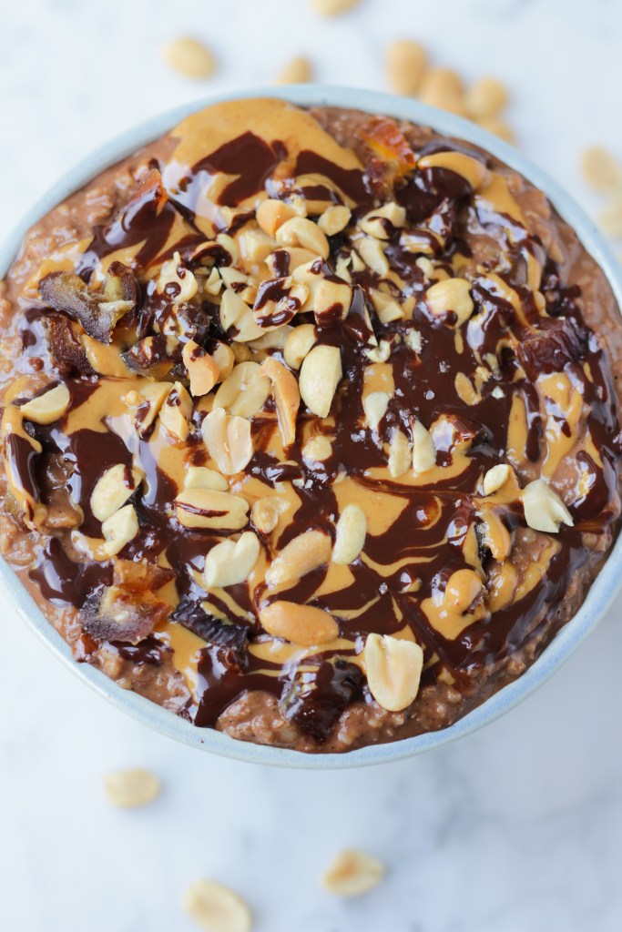 Snickers lovers opgelet! Naast mijn ‘Bounty havermout’ maak ik sinds kort ook graag deze Snickers variant. Dit klinkt wellicht als een decadent ontbijt (en dat is het ook) maar gelukkig zitten er in dit ontbijtgerecht ook veel goede voedingsstoffen waardoor je er uren op vooruit kunt. De karamel en noga uit de Snickers heb ik vervangen door zoete, chewy dadels. Ze geven naast een heerlijk zoete smaak ook de nodige mineralen en vezels. Raw cacao poeder geeft je, naast o.a. een flinke lading antioxidanten, je choco fix. En de pindakaas en pinda’s zorgen voor een dosis gezonde vetten en eiwitten maar zijn ook die heerlijke hartige, zoute tegenhanger