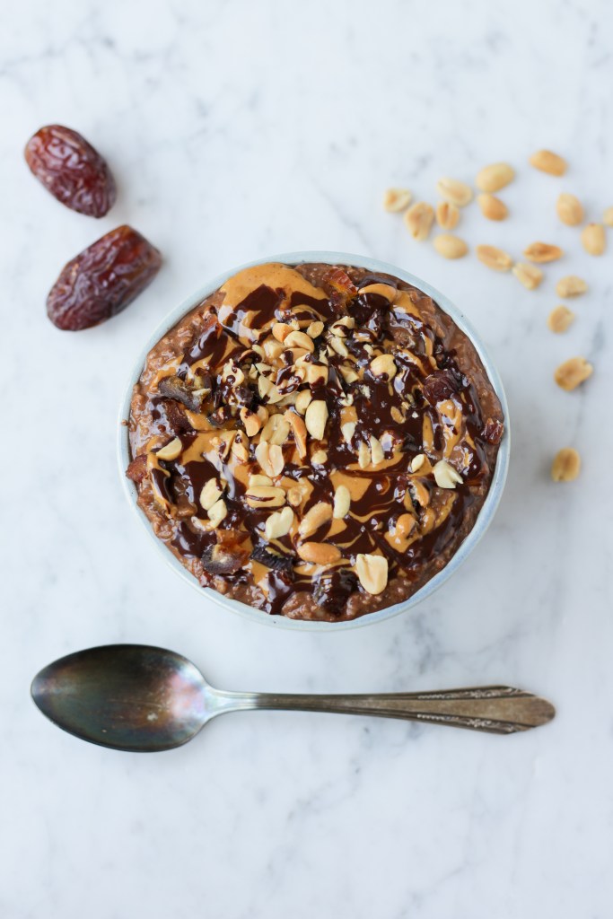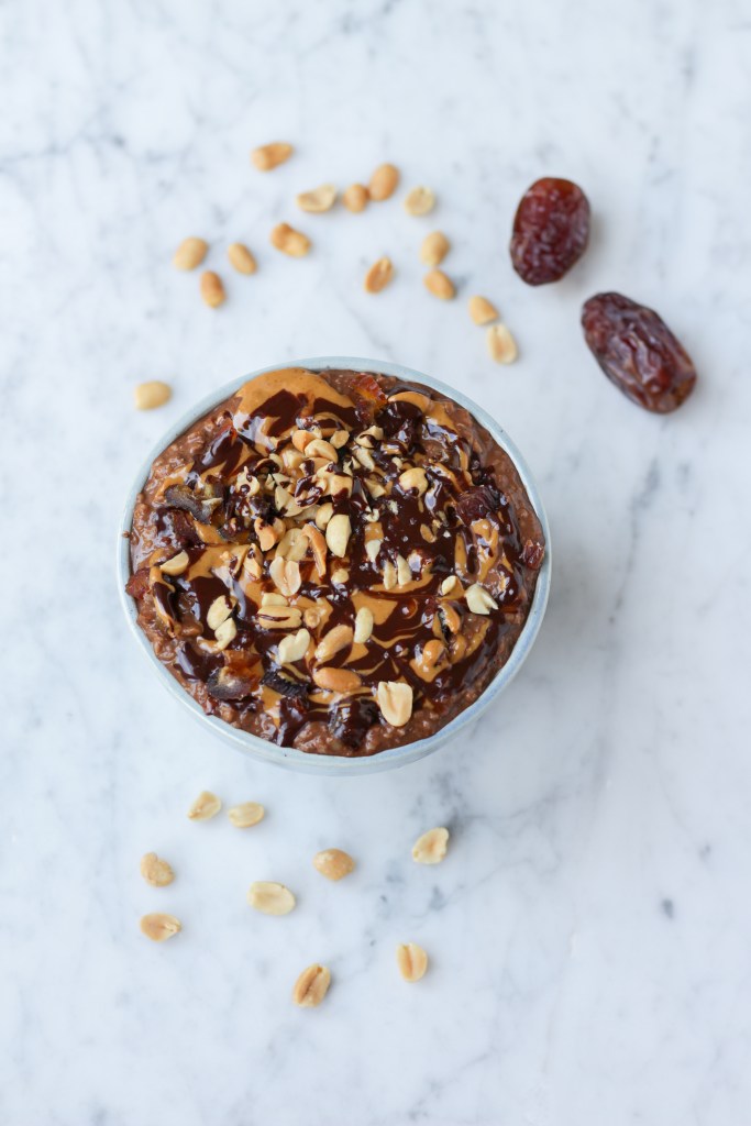 - Garneer de pap met de overgebleven theelepel pindakaas, de overgebleven reepjes dadel en optioneel wat gehakte pinda’s en (gesmolten of gehakte) pure chocolade. Heavennn!
