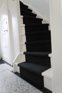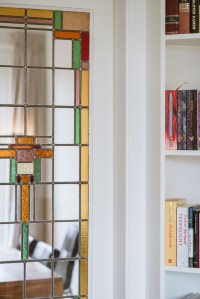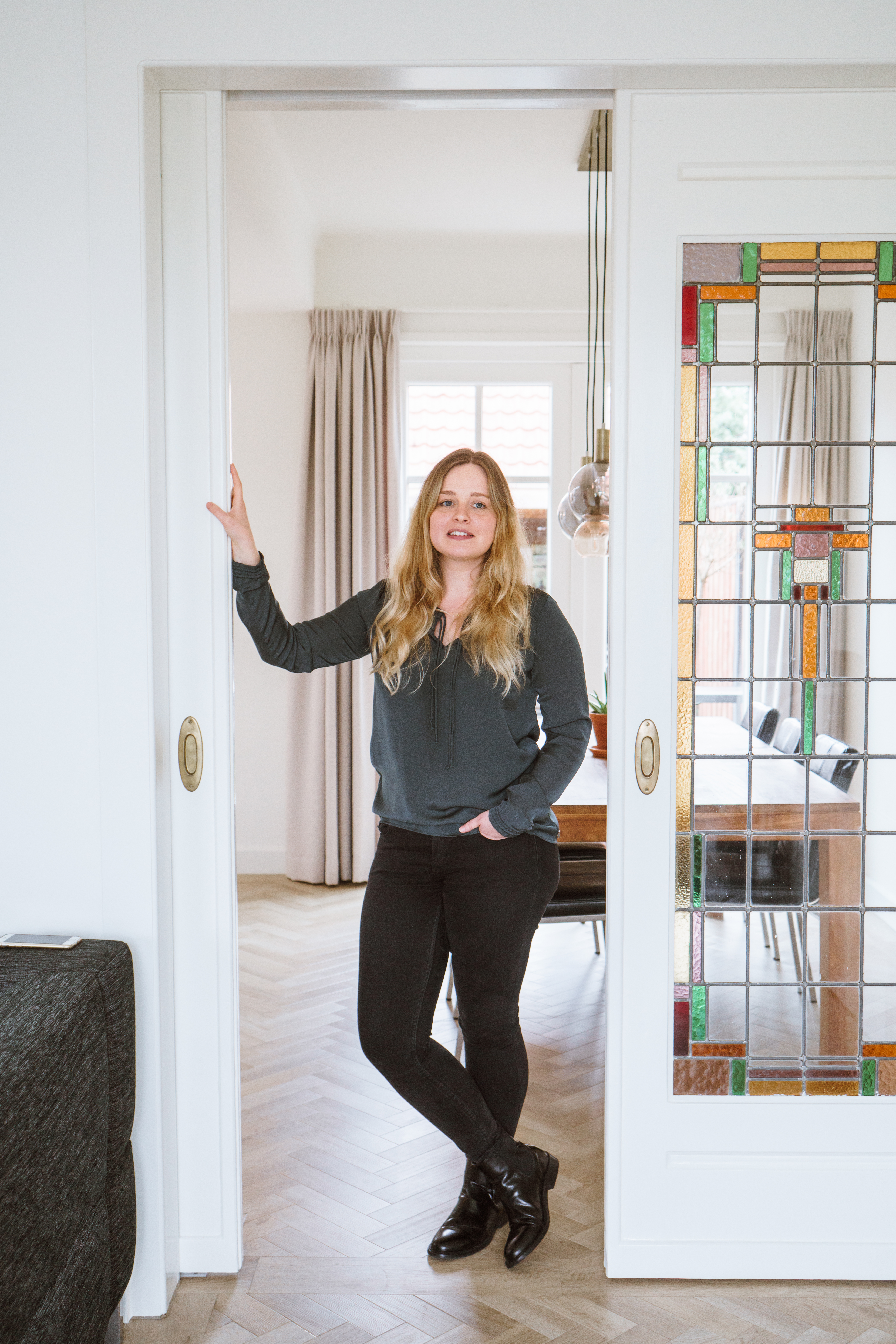 Omdat het een ouder huis is uit de jaren ’40 waren er nog veel oude details aanwezig zoals paneeldeuren en glas-in-lood ramen; deze hebben we dan ook allemaal weer in ere hersteld. We wilden die stijl van het huis benadrukken en hebben daarom nog meer toegevoegd zoals granito-vloeren in de hal, toiletten en overloop en een visgraatvloer (bedankt voor de tip Stulp Interieur!) op de benedenverdieping. Verder zie je overal messing accenten terug en de originele en suite deuren met hoekkasten zijn teruggeplaatst zoals we die op een oude bouwtekening van het huis zagen. Ook hebben we gekozen voor een zwarte traploper op beide vaste trappen.