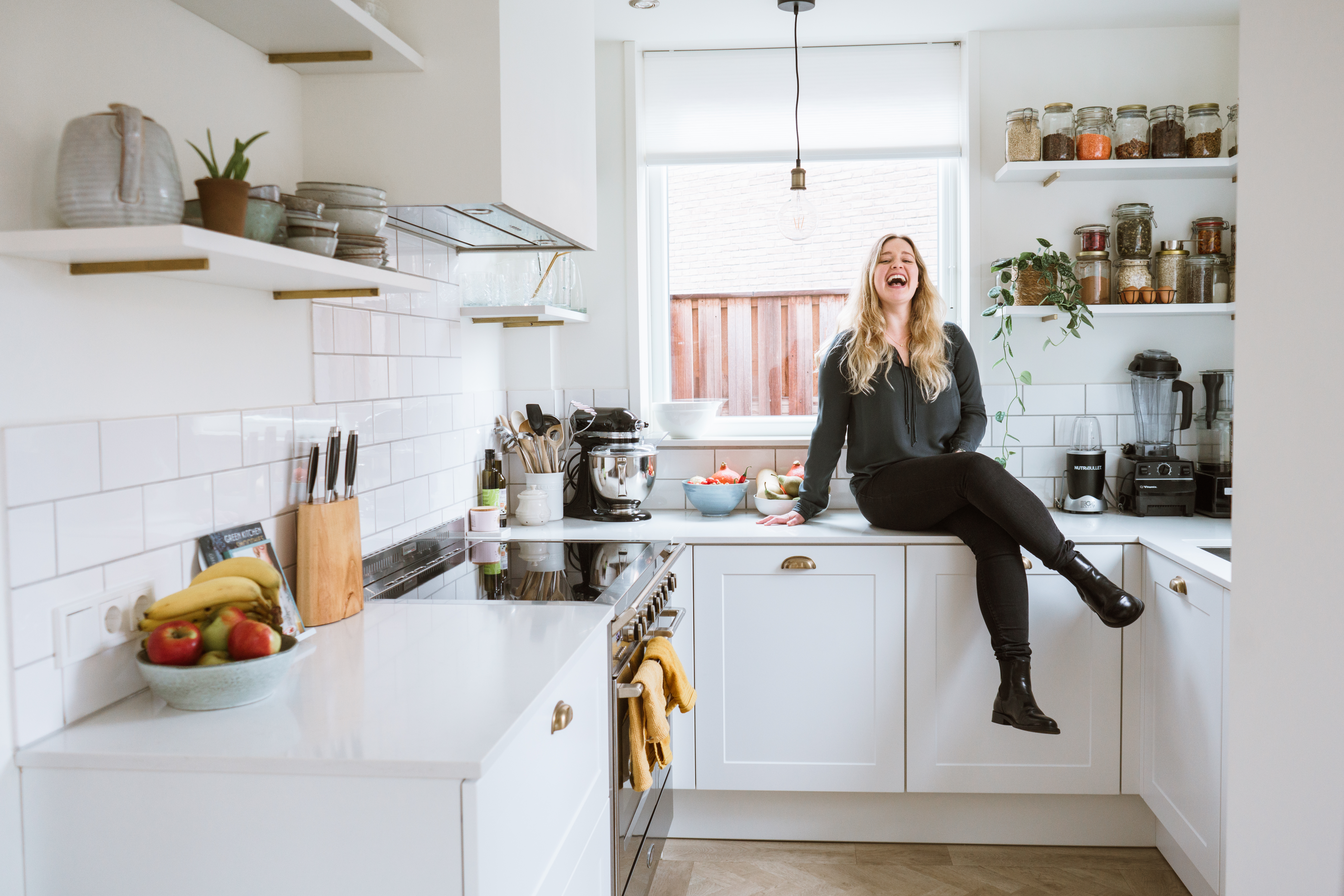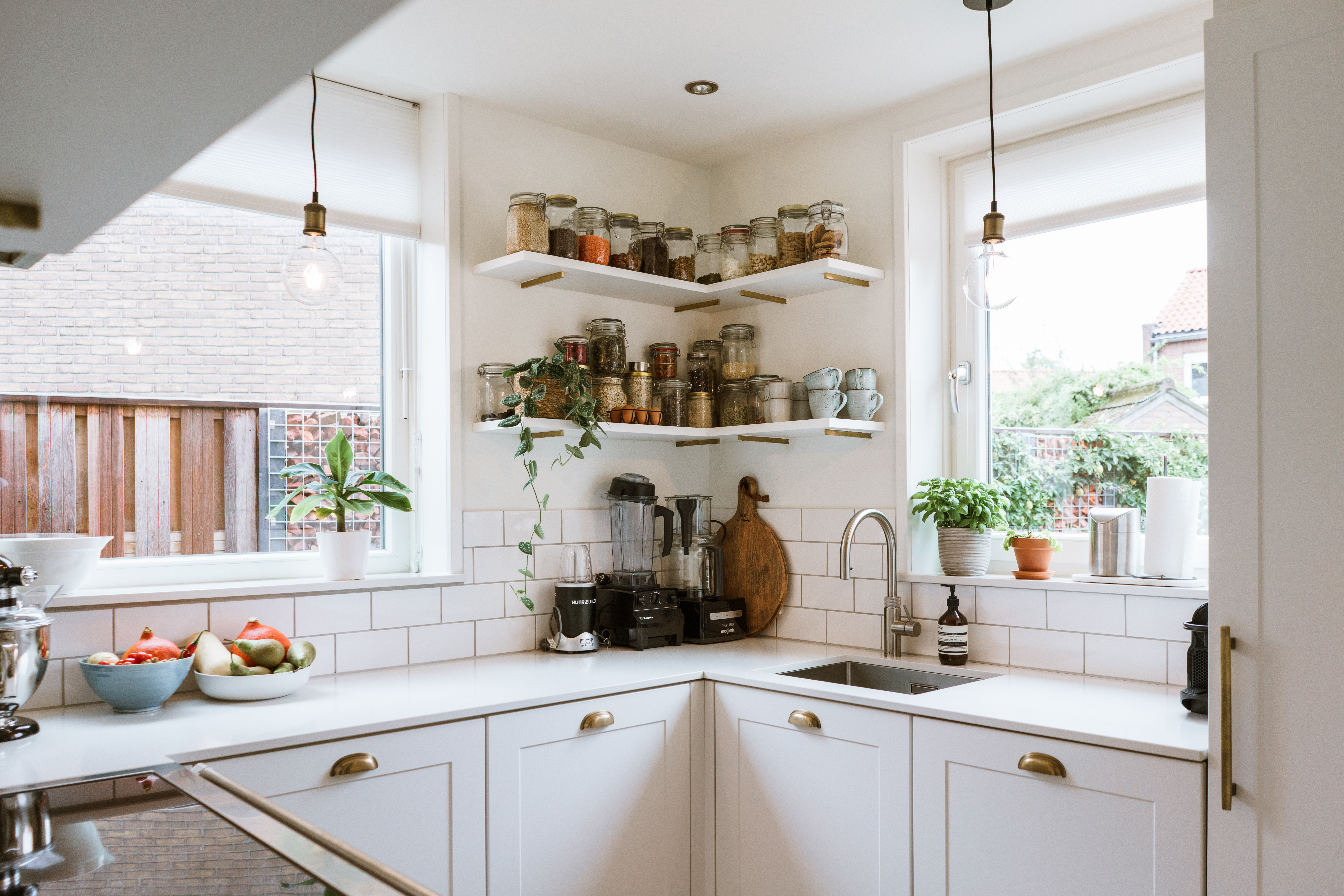 Verder moesten we werken met de ruimte die er was. Het is geen grote keuken dus helaas geen kookeiland voor mij. Maar wel een hele praktische u-vorm keuken met veel werkblad-oppervlak waarin het heel fijn werken is. Omdat de ruimte niet heel groot is wilde ik geen bovenkastjes; dit zou de ruimte mijn inziens zwaar en optisch kleiner maken. Vandaar dat we voor open planken hebben gekozen. Ik houd ook van de gezelligheid die open planken uitstralen; je kunt er van alles op uitstallen! Mijn vader kwam met het geniale idee om messing staven in de muur te verankeren zodat de planken die aan de muur zitten het niet zouden begeven (dat is me in het verleden namelijk wel eens gebeurd; ik pak planken altijd helemaal vol haha) en het er optisch mooi uit zou zien. Al met al ben ik super blij met het eindresultaat; het is écht onze droomkeuken geworden!