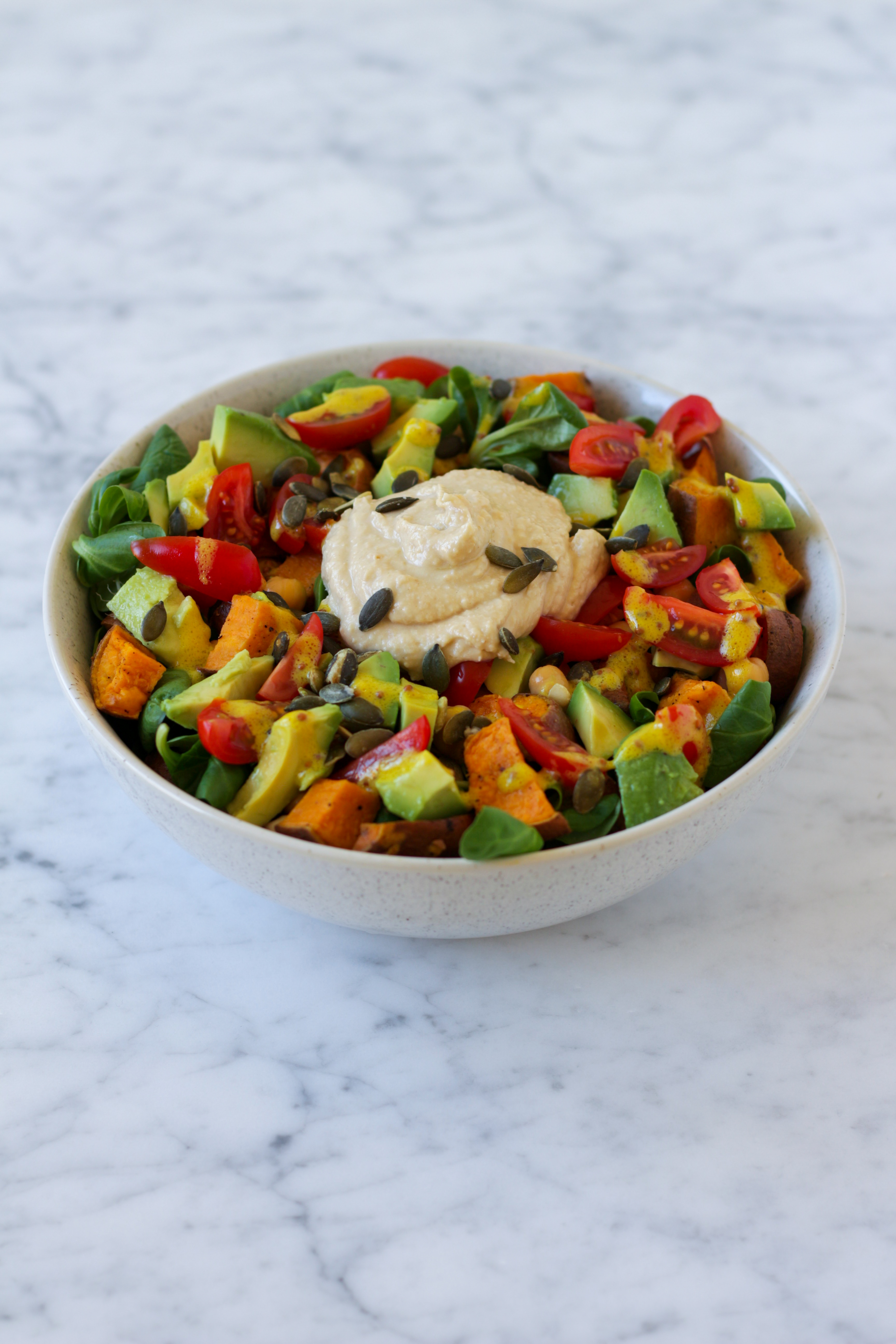 - Serveer de salade met de dressing, een flinke dot hummus en bestrooi met de pompoenpitjes.
