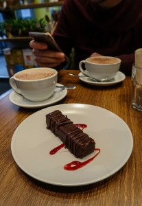 Voor allerlei soorten vegan taartjes, soep, salades en plantaardige chocolademelk en latte’s. Bij onze warme choco deelden we een raw Twixbar. Lekker! Dit café werkt alleen met biologische producten en alles is vrij van gluten en zuivel.