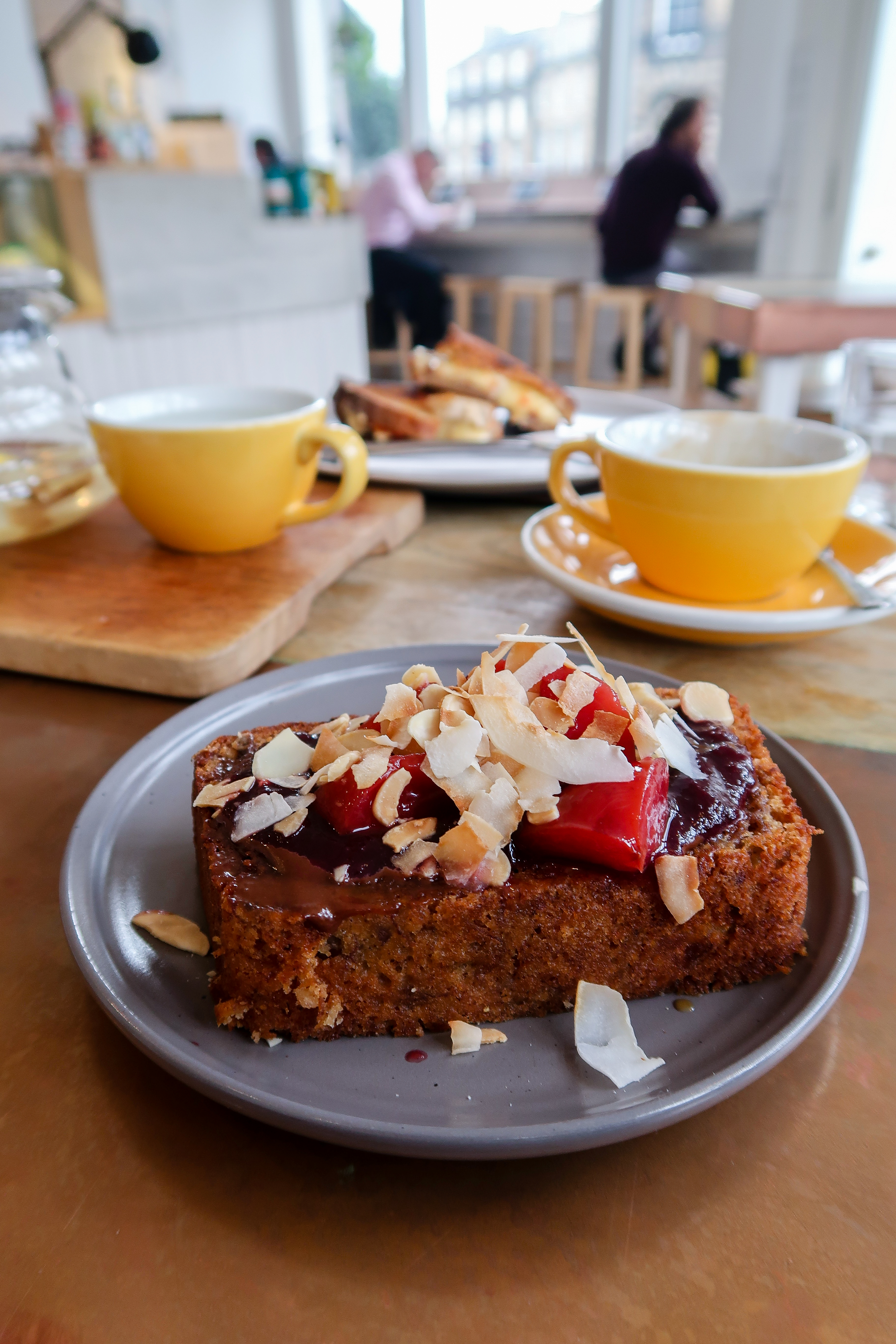 IMG_3161 december 4, 2019 3648 × 5472 Healthy Hotspots in Edinburgh Bananenbrood met choco-tahin spread en fruit compote