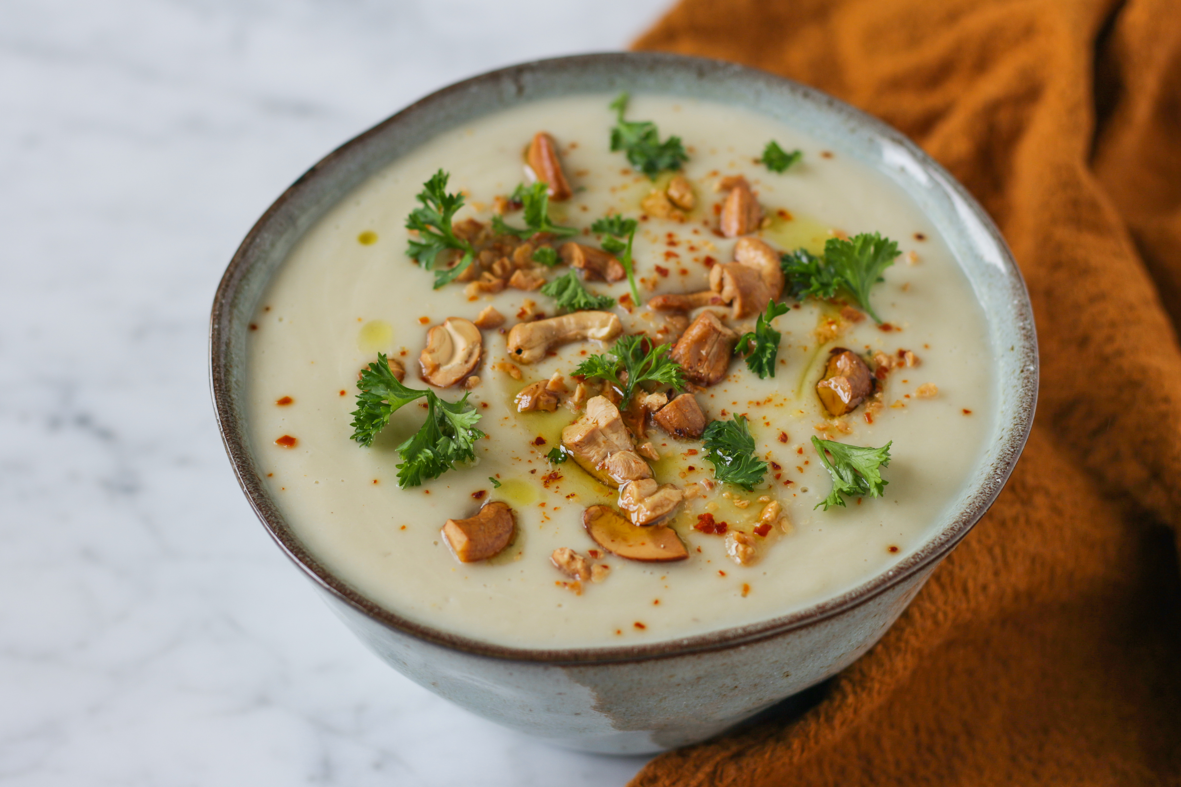 - Breng de soep op smaak met zeezout, peper en citroensap en serveer met geroosterde cashews, chili flakes, peterselie en een wat truffelolie. Enjoy!