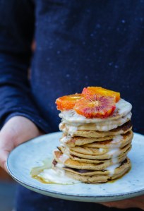 - Verwarm een klontje kokosolie in een koekenpan en bak per keer 3 kleine pannenkoekjes. Draai ze voorzichtig om zodra er belletjes aan de bovenzijde ontstaan. Herhaal dit tot je beslag op is.