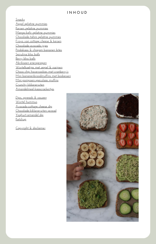 Dan volgt het recepten gedeelte. De recepten borduren voort op de ‘baby led weaning’ methode waarbij het kindje zelf eet (met bestek en/of handen). Ze zijn stuk voor stuk ontzettend voedzaam en gericht op jonge kindjes die veel energie en essentiële bouwstoffen nodig hebben. Denk aan voedzame en vullende ontbijtjes (zoals verschillende soorten pap, chiapudding, pannenkoeken, eiergerechten, smoothies en yoghurt), hartige lunches (zoals allerlei gehaktballetjes, fritters, dips, broodbeleg varianten en soepen), avondmaaltijden die ook geschikt zijn voor het hele gezin (zoals ovengerechten, curry’s, stoofpotjes, pasta’s en voedzamere varianten van kipnuggets, pizza en vissticks) en lekkere dips waardoor zelfs de grootste kritische eter wellicht een hapje rauwkost wil proberen ;). Ook geef ik 6 concrete voorbeelden van hoe je een voedingsstofrijke lunchbox kunt maken met de recepten in dit e-book voor mee naar de opvang/grootouder(s)/peuterspeelzaal of school. Natuurlijk ben ik de snacks niet vergeten, aangezien dreumesen en peuters daar gek op zijn 😉 Wat te denken van mini bananenbrood muffins met bosbessen, abrikozen energiereepjes, gelatine gummies in allerlei smaken, froyo van cottage cheese & kersen, amandel-kaas crackertjes, crunchy kikkererwten of choco chip havercookies met cranberry’s? En dit is nog maar een kleine greep uit de recepten!