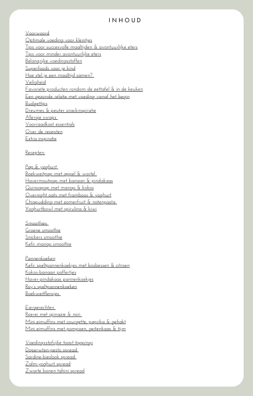 ‘Nourishing’ heb ik toegevoegd aan de titel omdat dit refereert aan het optimaal voeden van jouw kindje. En dat is precies waar dit e-book om draait en waarin het zich onderscheidt. Optimale hoeveelheden van belangrijke voedingsstoffen om te floreren qua groei en ontwikkeling. Mijn doel was een receptenboek maken voor de hele familie, waar iedereen van mee kan eten zonder al te veel aanpassingen en met een focus op verse, natuurlijke voeding rijk aan belangrijke nutriënten. Zonder stress of moeilijk gedoe. Dat is namelijk hoe wij het zelf hier thuis ook doen. Het telt in totaal 120 pagina’s met daarin ook heel veel waardevolle informatie rondom voeding voor kindjes.