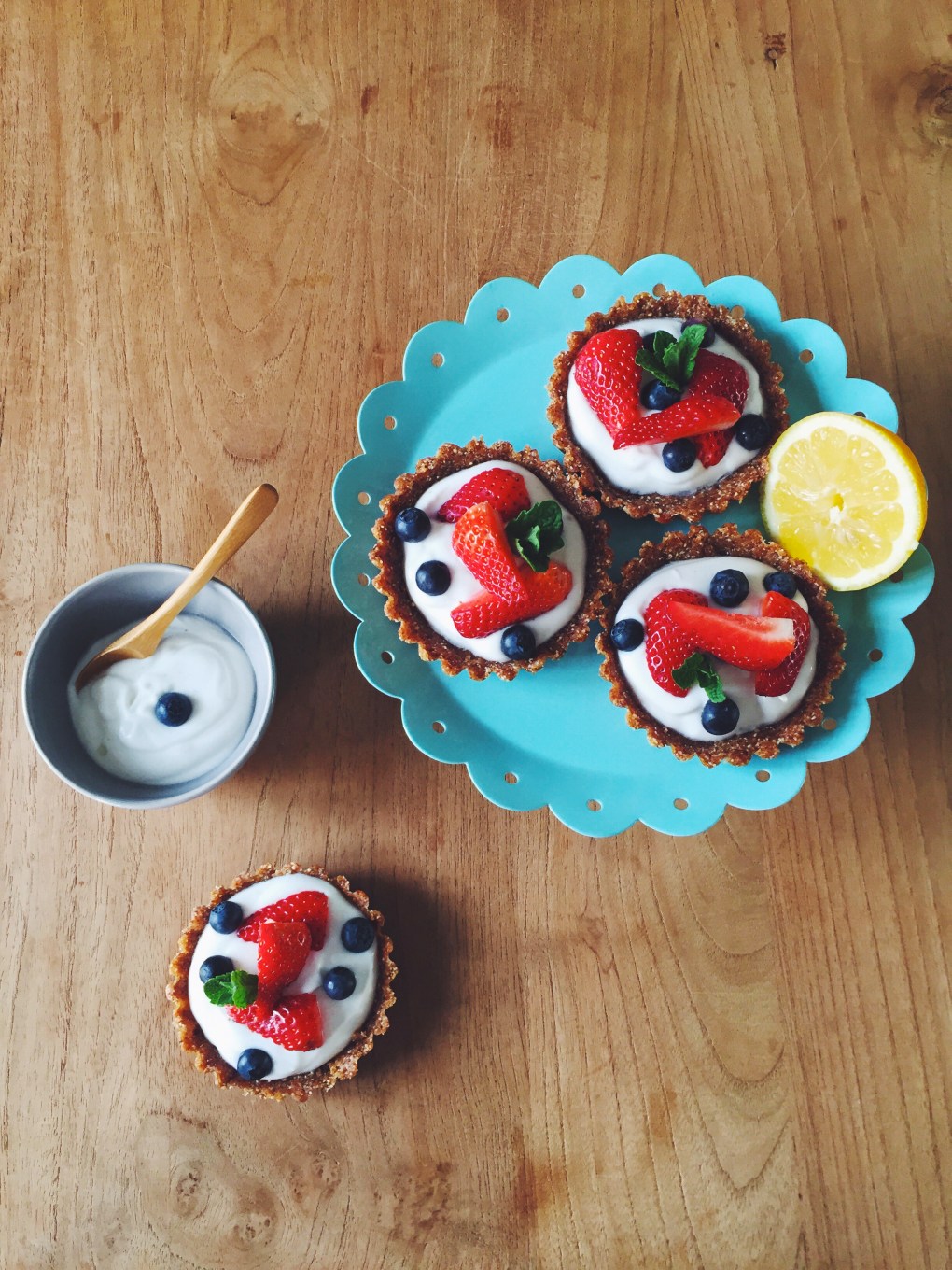 Deze week een nieuw recept met heerlijke Abbot Kinney’s kokosyoghurt. Deze fruitige taartjes zijn een echte traktatie en passen perfect bij de warme, zomerse dagen die eraan zitten te komen! De bodem bestaat uit rauwe noten, kokos en dadels waardoor dit gezonde taartjes vol voedingsstoffen zijn! Geen suikerdip of opgezette buik (zoals bij reguliere gebakjes) maar een voldaan, langdurig verzadigd gevoel en energie! Door de taartjes te vullen met romige kokosyoghurt & verse vanille wordt het pas écht een hemels gebakje!